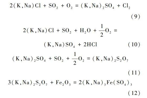 水合硫酸钙影响混凝土凝结时间,为改善水泥凝结状况,应控制S含量在合理范围内。一定S含量可以增加熟料早期强度,降低熟料液相出现温度和黏度,起到矿化剂的作用。且S含量过高时,氧化气氛下,碱金属氯化物与SO 2 反应生成Cl 2 ,形成的硫酸盐转化为低熔点焦硫酸盐(Na 2 S 2 O 7 熔点为410℃,K 2 S 2 O 7 熔点310℃),高温时呈熔融态,溶解破坏氧化膜,其过程涉及反应9~12,会腐蚀水泥窑耐火材料,降低熟料强度。城市固废根据其特性替代部分燃料或原料,因S含量远低于常规化石燃料可降低沉淀或阻塞问题。