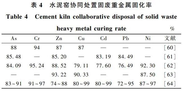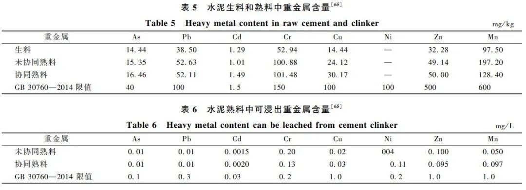 市政污泥和垃圾焚烧飞灰的化学特性、主要成分与水泥生料相似,生产的水泥在颗粒度、相对密度上与硅酸盐水泥相似,稳固性、膨胀密度、固化时间也较好。市政污泥在水泥窑中完全燃烧,充分利用有机成分的热值、实现节能的同时,又能将无机成分作为水泥原料,实现安全处置与利用。污泥含水率越高,热值越低,不添加额外燃料可协同处置含水率高达50%的市政污泥。水泥窑协同处置垃圾焚烧飞灰时,利用高温可去除99%的二噁英,窑内碱性环境抑制酸性气体(如HCl、SO 2 、HF等)排放,同时能将飞灰中大部分有害重金属固化,表4研究数据显示该技术对Cr、Zn、Cu元素的固化效果较好。且处置后水泥熟料中的重金属含量及浸出浓度均满足《GB30760-2014 水泥窑协同处置固体废物技术规范》的要求(见表5、6)。还要考虑固废对生产工艺、窑炉运行的影响。因垃圾焚烧飞灰、市政污泥含有大量的S、Cl、碱金属和重金属离子,掺入后加剧其在窑内循环和富集,引起内部构件腐蚀,导致结皮结圈问题,严重时将引起预热系统堵塞,从而影响水泥窑正常生产运行。