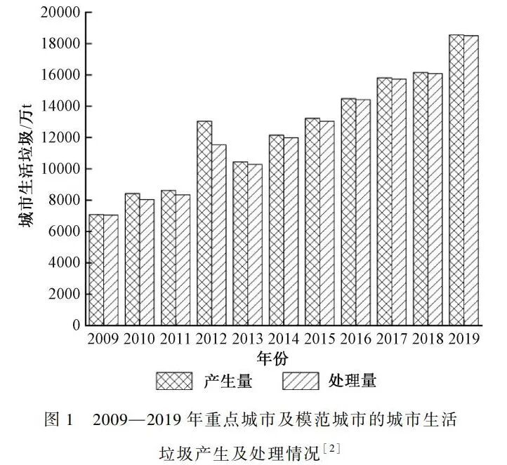 城市固废多,来源广,成分复杂,产量巨大。中华人民共和国生态与环境部发布的《2020年全国大中城市固体废物污染环境防治年报》显示,2019年我国196个大、中城市一般工业固体废物产生量为13.8亿吨,工业危险废物产生量为4498.9万吨,医疗废物产生量为84.3万吨,城市生活垃圾产生量为23560.2万吨(其中2009~2019年重点城市及模范城市的城市生活垃圾产生及处理情况见图1)。