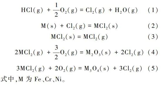 陈应强等人已经证明,Cl与金属或氧化物发生气相腐蚀,还会与其他元素形成低熔点氯化物(如FeCl 2 、PbCl 2 、ZnCl 2 )造成热腐蚀,金属氯化物的腐蚀过程包括: