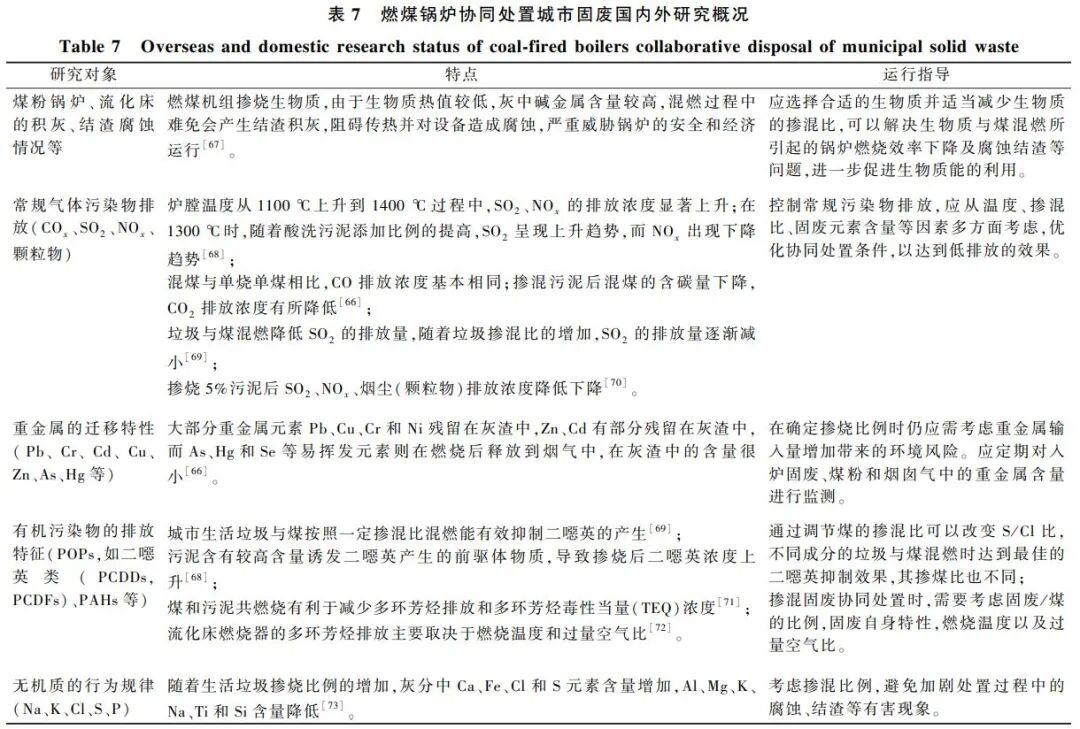 电厂燃煤锅炉也是一种常用于城市固废协同处置的工业设备,炉型主要包括煤粉锅炉和流化床锅炉等。 国内外对燃煤锅炉协同处置固废进行了相关研究,包括生物质、垃圾衍生燃料(RDF)、污泥、药渣、塑料、废旧轮胎、其他木质废物等。主要研究的内容如表7所示,有关运行工况及污染物排放问题均引起较高关注。