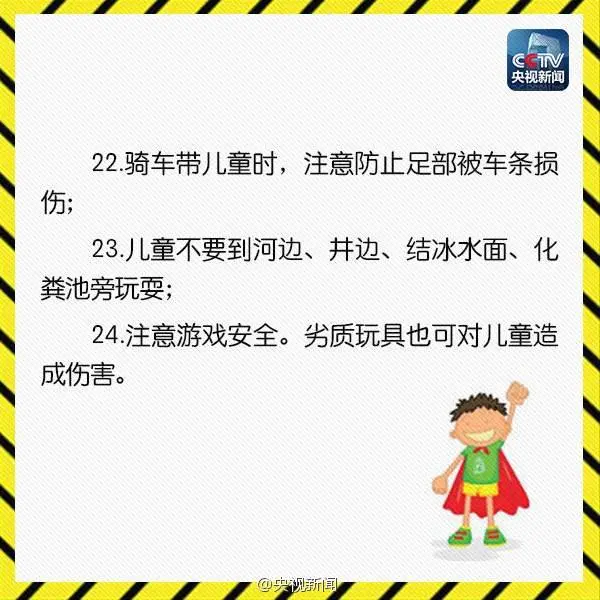 全球儿童安全组织调查显示:意外伤害已成为中国1至14岁儿童的首要死因。如何减少安全隐患?下面这24条提示每个人都应该详细了解。