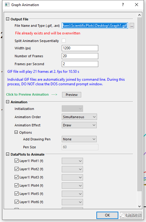 绘制好图形,打开Graph Anim插件,设置相应的Output File、Animation、Dataplots to Animate等选项,点击Preview预览结果,点击OK自动导出为动图或者视频。