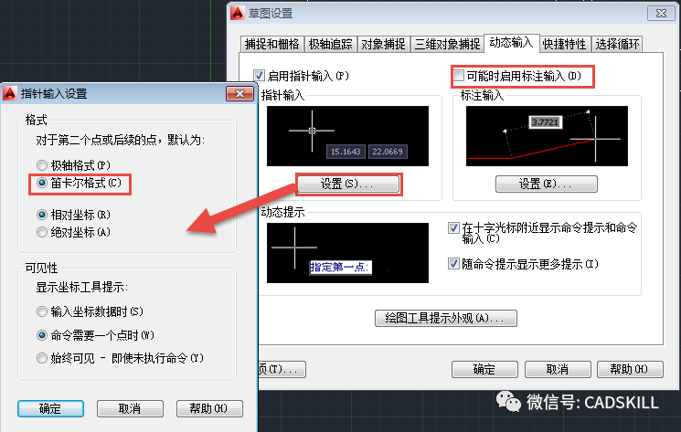 在实际绘图中会经常输入相对坐标,但输入极坐标却比较少,而CAD的动态输入默认就是输入极轴格式的坐标,如果打开了标注输入,即使设置成了笛卡尔格式坐标,默认还是让我们输入长度和角度。为了输入相对的XY坐标更方便,有些人就将动态输入的设置改成了上图这样。