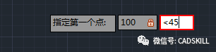 1、假设我们绘制直线,在确定第一点坐标的时候就输入极坐标100<45。当我们输入完100后如果输入<符号,会自动切换到下一个输入框,并且会提示我们输入的是角度,如下图所示。