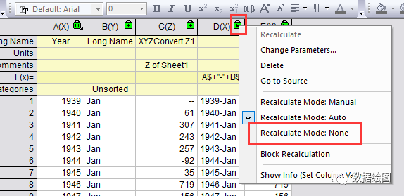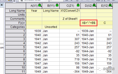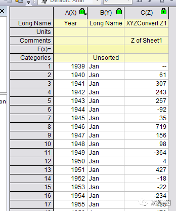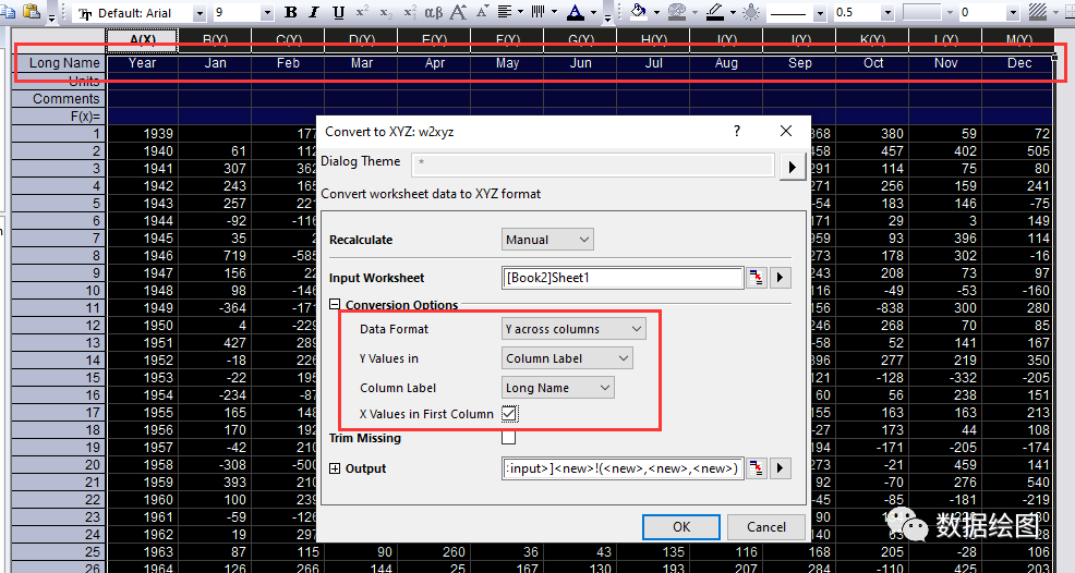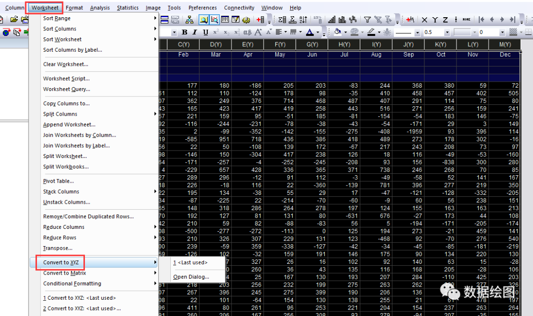 Worksheeet菜单中打开Convert to XYZ功能页面。Data Format选为Y cross columns,Y Values in设为Column Label,Column Label选为Long Name(根据实际需求来设置),同时勾选X Values in First Column。