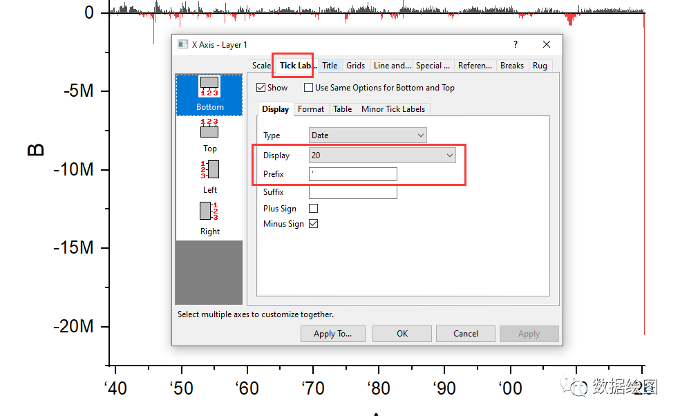 Scale页面,将Display选为20,在Prefix里输入',以简单的形式来表示年份。