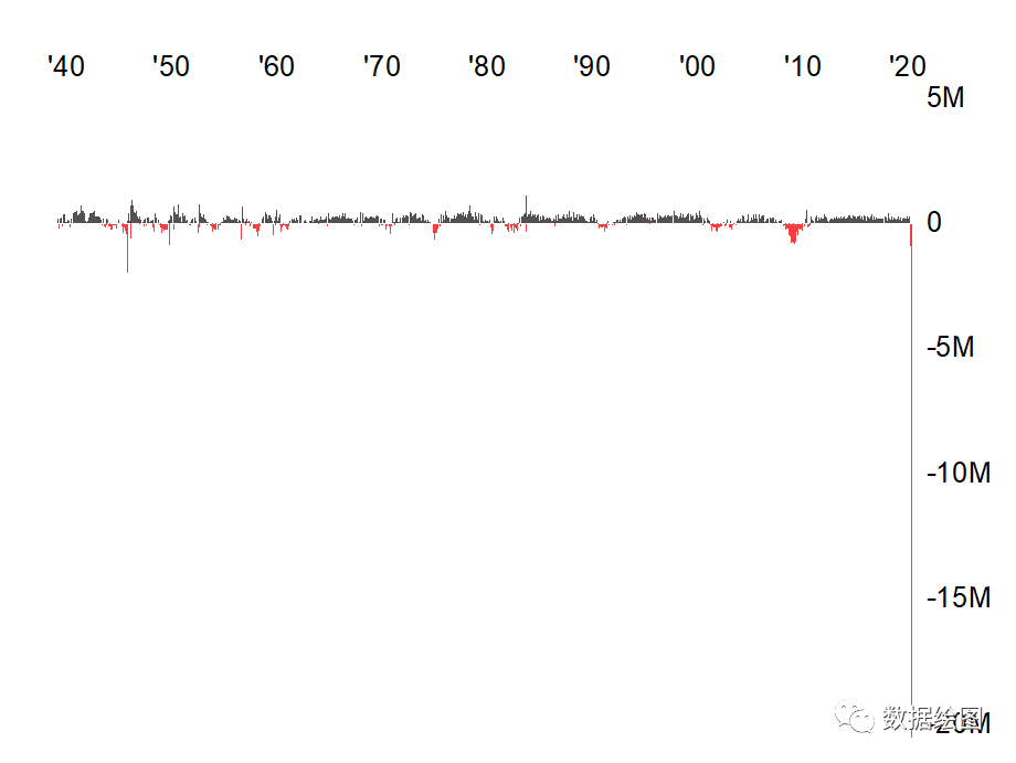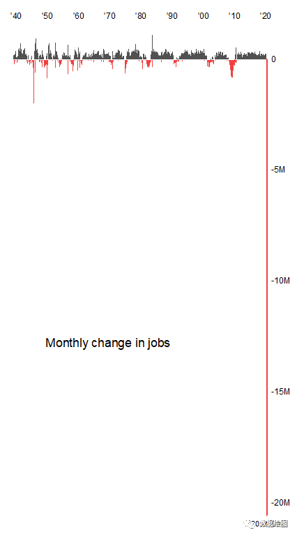 最近看到了一张图,最初是发在The New York Times上。特别夸张的用一整个头版,图也一定要长,才能看清2020年4月份失业人数的陡增。这个图除了夸张的对比,还有就是正、负方向上的不同着色。