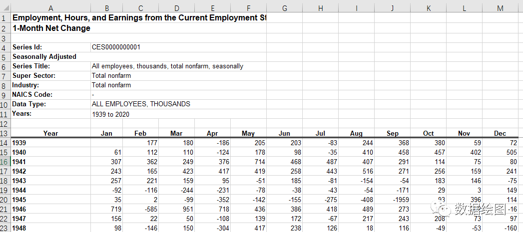 下载自美国劳工统计局(https://www.bls.gov/),下载的原始数据是`xlsx`格式,数据存储形式为**宽格式**,即按月份来分列存储的。