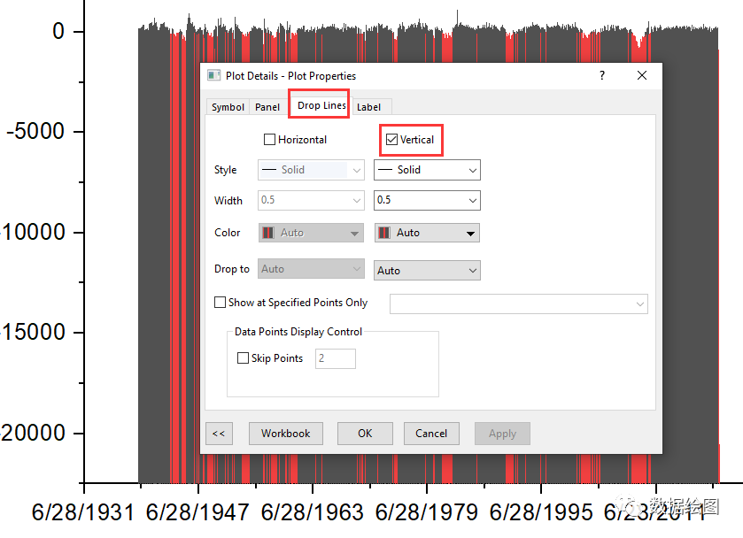 Drop Lines页面,勾选Vertical,即显示垂直方向上的垂线。此时垂线的Drop to是默认为到Y=Axis Begin,在设置坐标轴格式时会添加Custom Additional Line,即Y=0。