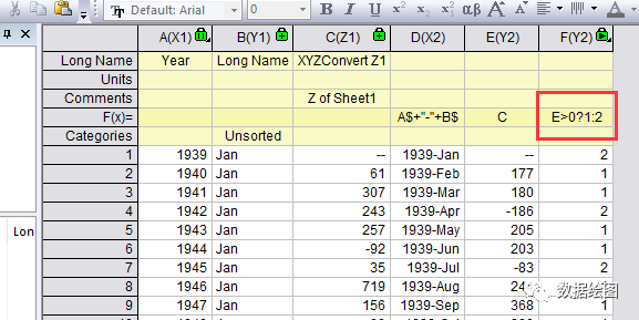 F(x)中输入E>0?1:2,意思是如果E中的数据大于0,F列数据为1,否则为2。