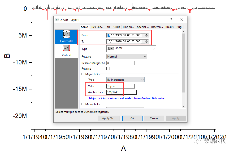 Scale页面,设置合适的From和To,以及Major Ticks的值为10year,Anchor Tick设为1/1/1940,目的是将第一个坐标轴标签设为1940年开始,默认的是1939年。