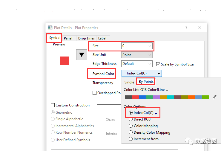 Plot Properties对话框,设置曲线格式。首先在Symbol页面,将Size设为0,将Symbol Color设为By points,颜色选为Index,数据来源为分组数据,即Col(C)。