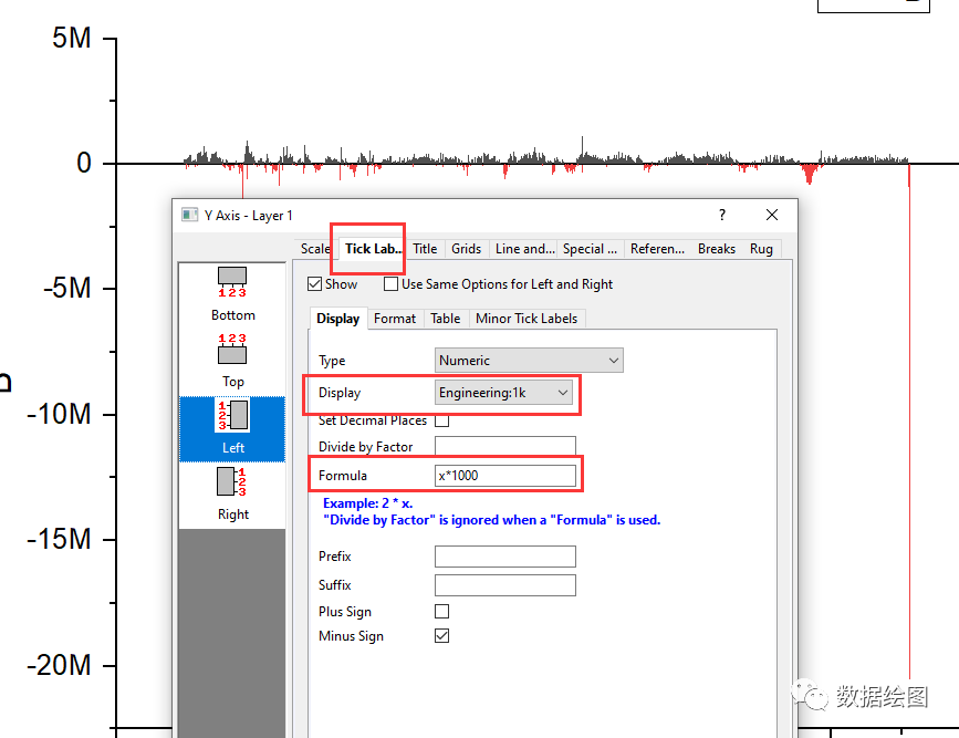 Tick Labels页面,将Display选为Engineering。同时下载的数据的单位是千人,可以在Formula里输入x*1000,将单位换算成人。