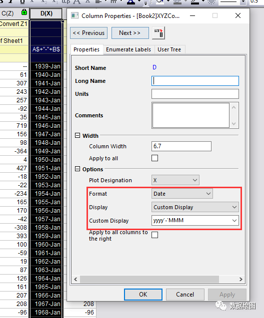Properties,设置其数据格式为日期形式,根据当前数据,依次设为Date,Custom Display,yyyy'-'MMM。