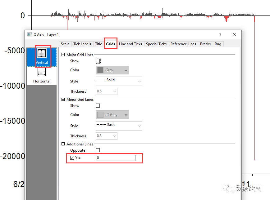 Grids页面,勾选Additional Line下的Y=0,即垂足的位置,此时正、负方向上显示了不同的颜色。