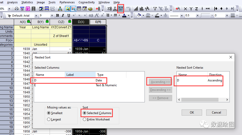 Selected Columns中选中D,使用Ascending按钮将其添加到右侧Nested Sort Criteria中,并勾选底部Sort下的Selected Columns,即对选中的列,以D列为依据,进行升序排列。