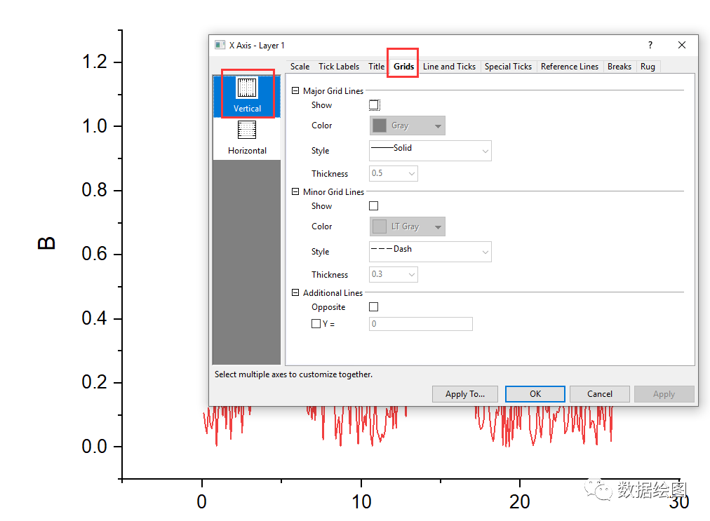 双击坐标轴打开Axis Properties对话框,切换到Grids页面,但要切换到Vertical页面;