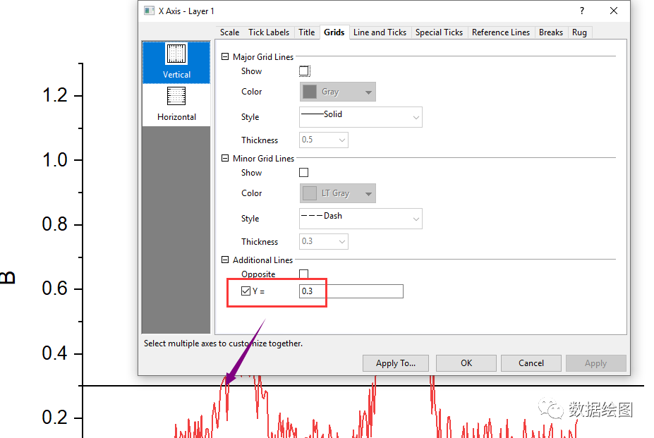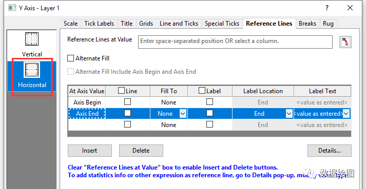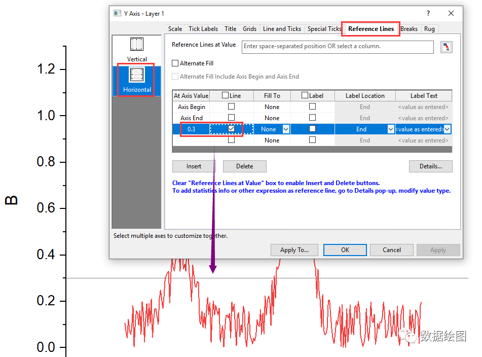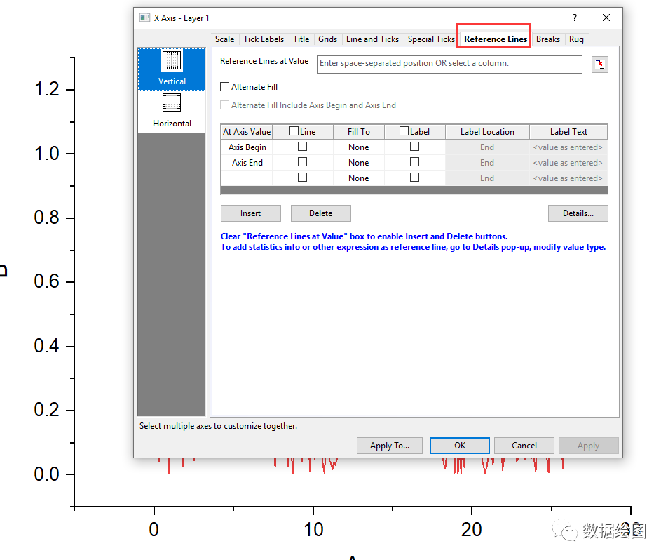 双击坐标轴打开Axis Properties对话框,切换到Reference Lines页面;
