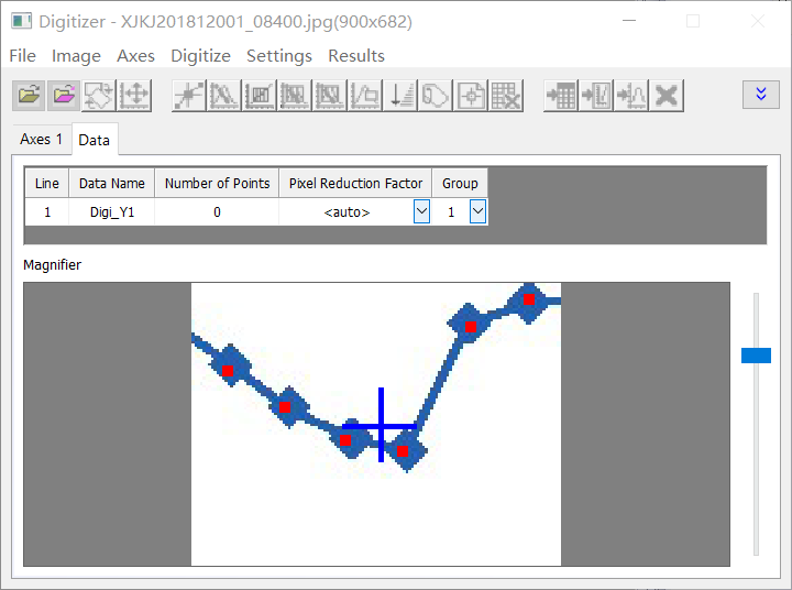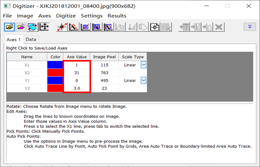 Step3:默认进入坐标轴设置界面,通过点击拖动的方式可以调节红线和蓝线(蓝为原点,红为终点)与图像中坐标轴重合,用来定标点的位置,然后在Axis Values中设置坐标起点和终点代表的数据值;
