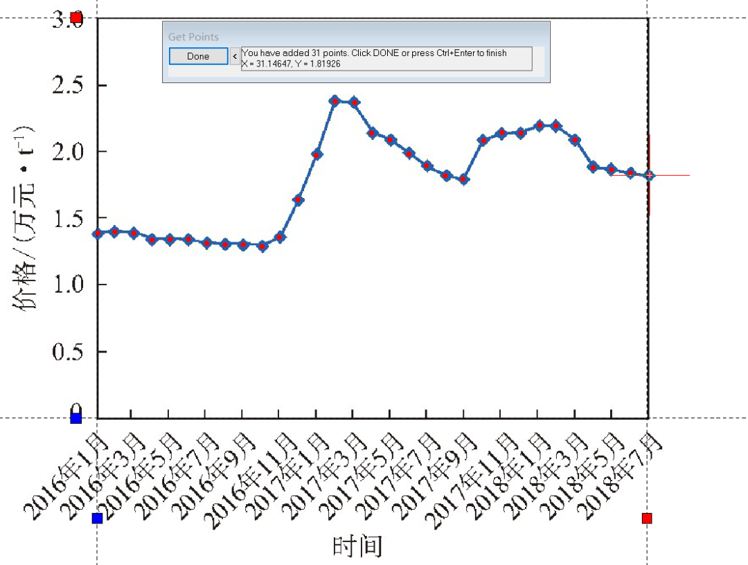 图片可以把数据的大小、趋势等信息直观地展示在我们面前,尤其是PPT汇报和答辩的时候,良好的绘图习惯可以给人以舒爽的感觉。绘图的前提是要有数据,但很多文献和某度的数据都是以图片形式给出的,清晰度或者绘制方法与上下文不搭,如何才能相对客观地把图片中的数据信息提取出来?用尺子测量的方法,貌似初高中考几何题还管用,但看的时候总是有很强的主观性。Origin里面的Digitizer功能可以圆满解决上述问题!以2016-2018年我国聚异戊二烯橡胶市场价格图为例(数据来源:崔小明.国内外聚异戊二烯橡胶市场分析),展示具体操作步骤。