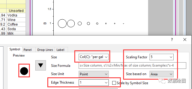气泡大小:双击散点,打开Plot Properties页面,将Symbol选为⚪,Size选为Col(C),Size based on可选为Area,并调整Scaling Factor至一个合适的值。