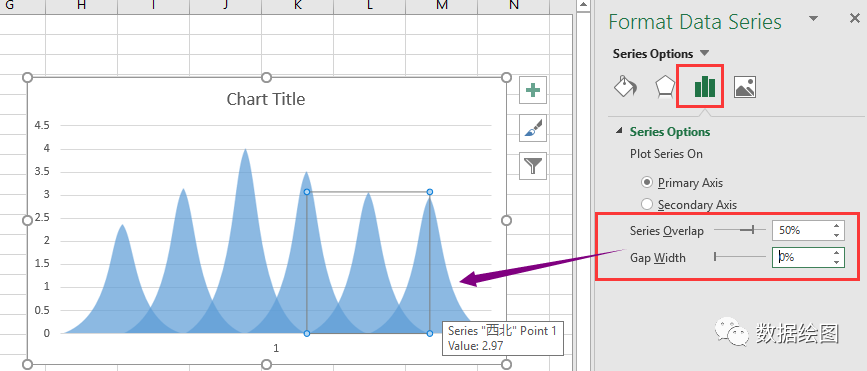 选中其中一个“山峰”,右击打开Format Data Series,将Series Overlap设为50%,将Gap Width设为0,这就实现了叠加的效果。如果前面不将数据转换为多个系列(Series),不能进行此步操作。