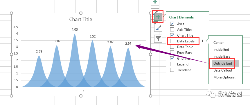 选中图形,点击右上角的加号,展开Data Labels,选中Outside End,添加标签。