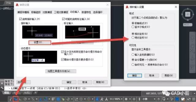 设置方法很简单,右键单击底部状态栏的动态输入按钮,就可以打开动态输入对话框,在对话框的指针输入框中单击设置按钮,就可以设置默认的输入格式是极坐标还是笛卡尔坐标,是相对坐标还是绝对坐标。