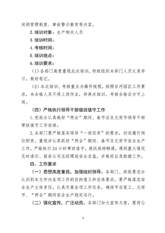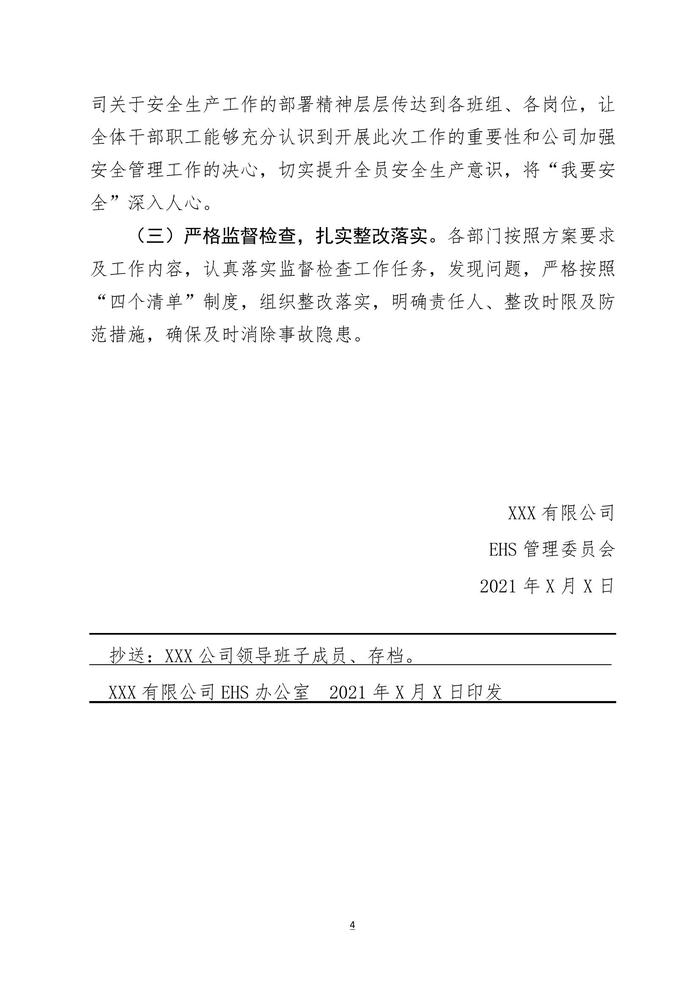 XXX有限公司文件文号 〔2021〕X号XXX有限公司关于印发2021年节后复工复产安全生产工作方案的通知公司所属各部门:为深刻汲取历年生产安全事故经验教训,进一步做好复工复产安全管理工作,强化全员安全意识和责任意识,加强“两会”期间、春节后及元宵节安全生产工作,确保特殊时段安全生产维稳运行。根据《上级监管单位工作通知》(文号)、《上级监管单位工作通知》(文号)文件要求及2月13XXX监管单位安全生产专题会议部署精神,经公司EHS管理委员会研究,决定组织开展节后复工复产前安全培训、考核及检查工作,现制订方案如下:一、指导思想认真贯彻落实上级政府监管部门及股份公司关于节后安全生产工作部署的要求,牢固树立“生命至上,安全发展”的思想,坚持问题导向,紧盯关键装置、重点环节,落实安全管理主体责任人,扎实做好节后复工安全生产工作,切实做到不落项、不留死角,确保“两会”期间、春节后及元宵节安全生产形势稳定。二、工作目标以确保公司安全平稳运行为目的,按照“全覆盖、零容忍、严监督、重实效”的要求,以重点装置及主要生产部位为中心,全面开展安全专项检查,有效遏制安全事故。同时,进一步加强全员安全生产培训,做到不培训不上岗、不合格不上岗,为公司节后安全生产奠定坚实基础。三、工作内容(一)落实安全生产主体责任各部门要严格执行公司领导关于节后复工复产工作要求,认真履行安全生产主体责任,将安全生产工作逐级分解到班组、岗位,切实做实、做细,确保复工复产安全维稳运行。全面开展安全专项检查EHS部组织EHS管理委员会及工贸行业专家进行复工前专项检查工作,排查各类安全隐患,以生产设备为中心开展,做到隐患排查全覆盖,按照“四个清单”要求,做好闭环管理。2.公司各部门积极配合EHS部隐患排查治理工作,针对查处的问题,明确责任单位、责任人、整改措施及时限,对于不能一时整改的问题,要制定防范措施和工作计划,在规定时间内完成整改工作,并将整改情况反馈至EHS部,按照时间节点做好复查验收等闭环工作,保证节后复工安全生产稳定运行。(三)组织开展全员安全教育培训1.培训内容:主要安全生产工艺、操作规程、特殊作业、特种设备操作、闭锁管理制度、事故警示教育等内容。2.培训对象:生产相关人员3.培训时间:4.考核时间:5.培训地点:6.培训要求:(1)各部门高度重视此次培训,积极组织本部门人员认真学习,做好笔记。(2)本次培训、考核重点为操作规程,按照甘河园区工作要求,未合格人员不得上岗作业,待再次培训、考核合格后方可上岗。(四)严格执行领导干部值班值守工作1.党政办认真做好“两会”期间、春节后及元宵节领导干部带班值守工作安排。2.各部门要严格落实领导“一岗双责”的要求,切实履行岗位职责,重视并认真抓好“两会”期间、春节及元宵节安全生产工作,严格执行24小时带班值守,通讯保持畅通,遇到重大情况及时请示、报告公司总经理或安全总监,并做好应急救援工作。四、工作要求(一)思想高度重视,加强组织领导。各部门、班组要充分认识到本文件内各项工作的目的意义和总体要求,要严格落实安全生产主体责任,认真开展各项工作任务,确保节后复工、元宵节、“两会”期间安全生产稳定运行。(二)强化宣传,广泛动员。各部门加大宣传力度,要将公司关于安全生产工作的部署精神层层传达到各班组、各岗位,让全体干部职工能够充分认识到开展此次工作的重要性和公司加强安全管理工作的决心,切实提升全员安全生产意识,将“我要安全”深入人心。(三)严格监督检查,扎实整改落实。各部门按照方案要求及工作内容,认真落实监督检查工作任务,发现问题,严格按照“四个清单”制度,组织整改落实,明确责任人、整改时限及防范措施,确保及时消除事故隐患。XXX有限公司EHS管理委员会2021年X月X日 抄送:XXX公司领导班子成员、存档。 XXX有限公司EHS办公室 2021年X月X日印发