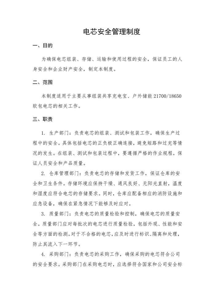 电芯安全管理制度一、目的为确保电芯组装、存储、运输和使用过程的安全,保证员工的人身安全和企业财产安全,制定本制度。二、范围本制度适用于主要从事组装共享充电宝、户外储能21700/18650软包电芯的相关工作。三、职责1. 生产部门:负责电芯的组装、测试和包装工作,确保生产过程中的安全。具体包括电芯的正负极正确连接,避免短路和过充等情况的发生。在组装、测试和包装过程中,要遵循严格的作业规程,保证人员安全和产品质量。2. 仓库管理部门:负责电芯的存储和发货工作,保证仓库的安全和卫生条件。存储环境应保持干燥、通风良好、无阳光直射,温度和湿度应符合电芯的存储要求。同时,仓库应配备相应的消防设施和应急设备,确保在紧急情况下能够及时应对。3. 质量部门:负责电芯的质量检验和控制,确保电芯的质量安全。质量部门应对每批次的电芯进行质量检验,包括外观、性能和安全等方面的检测。对于不合格的电芯,应及时进行标识、隔离和处理,防止其流入下一环节。4. 采购部门:负责电芯的采购工作,确保采购的电芯符合公司的安全要求。采购部门在采购电芯时,应选择符合国家和公司安全标准的供应商,并确保采购的电芯具备相关认证和资质。同时,采购合同中应明确电芯的安全要求和验收标准,确保采购的电芯符合安全要求。5. 运输部门:负责电芯的运输工作,保证电芯在运输过程中的安全。运输部门应对电芯进行充分的防护和固定,防止在运输过程中发生晃动、碰撞或振动等情况。同时,应选择合适的运输方式和路线,确保电芯能够安全、及时地到达目的地。四、安全管理制度1. 电芯的采购a. 采购的电芯必须符合国家和公司的安全标准,具备相关认证和资质。这可以通过检查供应商的质量保证体系、产品认证和实验室认证等方式来保证。同时,对于新的供应商或新的产品型号,应进行严格的风险评估,以确保其安全性能满足公司的要求。b. 供应商应具备良好的信誉和资质,确保能够长期、稳定地供应电芯。这需要建立严格的供应商筛选标准和评价机制,定期对供应商进行评估和审查,以确保供应商始终符合公司的要求。c. 采购合同中应明确电芯的安全要求和验收标准,确保采购的电芯符合安全要求。同时,应建立完善的进货检验制度,对每批次的电芯进行严格的检验,包括外观、性能和安全等方面的检测。对于不合格的电芯,应及时进行处理并追溯原因,防止类似问题再次发生。2. 电芯的存储a. 电芯应存储在干燥、通风良好、无阳光直射的环境中。这可以保证电芯的性能稳定和使用寿命。同时,仓库应配备相应的防潮、防尘、防震等设施,以确保电芯的存储环境符合要求。b. 电芯应按照其规格、型号、数量分类存储,避免混杂和错发。这可以通过建立严格的仓储管理制度来实现,使用电子化管理系统对库存进行管理,确保库存数据的准确性和实时性。c. 存储区域的温度和湿度应符合电芯的存储要求,以确保电芯的性能和安全。应定期对仓库的环境进行检查和记录,发现问题及时处理并追溯原因。3. 电芯的组装和测试a. 组装人员应经过专业培训,熟悉电芯的特性和安全要求。培训内容包括电芯的基本原理、组装工艺、安全操作规程等,以确保组装人员具备足够的专业知识和技能水平。同时,应建立完善的培训档案和考核机制,对员工的培训成果进行评估和反馈。b. 组装过程中应遵守操作规程,确保电芯的正负极正确连接,避免短路和过充等情况的发生。对于关键工序和特殊过程,应建立严格的工艺控制流程和检验标准,并进行监控和记录。同时,应加强设备的维护和保养工作,确保设备的稳定性和可靠性。c. 组装后的电芯应进行性能测试和安全检测,确保其性能和安全符合要求。测试内容包括电性能测试、环境适应性测试、安全性测试等,对于不合格的电芯应及时进行处理并追溯原因。同时,应建立完善的测试档案和数据管理系统,对测试结果进行分析和总结,为后续生产和研发提供参考和支持。4. 电芯的使用a. 使用前应仔细阅读产品说明书,了解电芯的特性和使用方法。这可以避免因使用不当而导致的事故和损失。同时,应建立完善的产品追溯制度和使用档案管理制度,对产品的使用情况进行跟踪和记录,以便在出现问题时能够及时处理和追溯原因。b. 使用过程中应遵守操作规程,避免过充、过放、短路等情况的发生。对于长时间不使用的电芯,应定期进行检查和充电,确保其性能和安全。同时,应加强设备的维护和保养工作,确保设备的稳定性和可靠性。c. 使用过程中应加强安全意识,注意个人防护和环境安全。对于可能发生的意外情况,应制定应急预案并进行演练,确保在紧急情况下能够及时应对。5. 电芯的废弃处理a. 对于废弃的电芯,应进行环保处理,避免对环境造成污染。这可以通过建立废弃物处理制度和使用环保材料等方式来实现。同时,应加强废弃物的分类和回收工作,提高资源的利用效率。b. 废弃的电芯应进行安全处理,避免发生火灾等安全事故。处理时应选择具有相关资质和经验的机构或人员进行,并加强监管和记录工作。6. 监督与检查a. 应定期对电芯的安全管理制度进行检查和评估,发现问题及时进行整改和优化。同时,应加强与其他部门或外部机构的合作与交流,吸收先进的经验和做法,不断提高安全管理制度