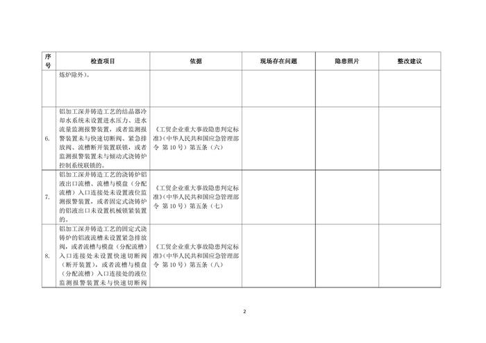 广东省铝加工(深井铸造)企业事故隐患清单检查工程师: 检查日期: 广东省铝加工(深井铸造)企业一般事故隐患检查内容参考增加:应急电源、应急水池检查项目。