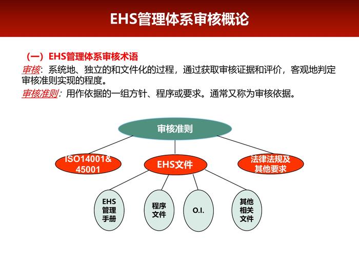 EHS管理体系审核本课程主要内容能源化工大数据平台-能化人必备 行业首创,不办会员也可扫码下载。 ※100万+标准规范,国标/行标/ASME/ASTM/国际标准全都有。 ※10万+HSE资料,全网最全,安全标准化/隐患排查/双控/法律法规。 ※10万+化工论文/电力论文/安全论文/环保论文。 ※10万+行业分析报告/图集/规范。 ※10万+行业书籍/教材。更多资料,登录www.cnmhg.com VIP会员尊贵权限 # 100万+标准规范随意下。 # 10万+HSE资料随意下 # 10万+化工论文/电力论文/安全论文/环保论文随意下。 # 10万+行业分析报告/图集/规范随意下。 # 10万+行业书籍/教材随意下。 #更有VIP会员合集专享。关注公众号,随时掌握行业动态加小编微信,进群天天享免费资料。EHS管理体系审核概论(一)EHS管理体系审核术语 审核:系统地、独立的和文件化的过程,通过获取审核证据和评价,客观地判定审核准则实现的程度。 审核准则:用作依据的一组方针、程序或要求。通常又称为审核依据。 EHS管理体系审核概论审核证据:与审核准则有关的并能够证实的记录、事实陈述或其他信息。 注:审核证据可以是定性的或定量的。 EHS管理体系审核:依据职业健康安全体系审核准则对组织的EHS管理体系的符合性、有效性进行客观评价的系统的、独立的并形成文件的过程。 EHS管理体系审核概论(二)EHS管理体系审核的分类: 第一方审核:以组织自己的名义进行的审核,即内部审核 第二方审核:以客户的名义进行的审核或以供方的名义接受的审核 第三方审核:以第三方名义进行的审核(外部验证机构)EHS管理体系审核概论(三)EHS管理体系审核作用 第一方审核:为顺利通过第二、三方审核做好准备 保持、持续改进环境健康安全管理体系 第二方审核:选择、评价、认可供应商(承包方) 促进供应商改进环境健康安全管理体系 第三方审核:得到符合ISO14001&45001标准的认证 减少重复审核和不必要的开支 识别改进机会,促进环境健康安全管理体系的持续改进 EHS管理体系审核概论(四)体系审核范围 注: 审核范围通常包括对实际位置、组织单元、活动和过程以及所覆盖的时期的描述 实际位置:是指受审核方的坐落位置或审核活动所在的地理 位置,包括固定位置和流动位置。 组织单元:指的是受审核的管理体系所涉及组织部门或职能 岗位。 活动和过程:指的是受审核的管理体系所涉及的活动和过程, 特别是管理体系所涉及的产品有关的过程或活 动,如环境监测等。 覆盖的时期:指的是受审核的管理体系实施或运行的时间段. 针对每一次具体的审核. 审核范围应形成文件,包括对实际位置、组织单元、活动和过程以及所覆盖的时期的描述.EHS管理体系审核步骤EHS管理体系审核步骤审核准备阶段 EHS管理体系审核步骤成立审核组——管理者代表应任命审核组长及审核员组成审核组。 审核组组长 资格:必须经过培训并考试合格的内部环境健康安全体系审核员; 业务范围:应与被审核部门无直接责任关系,但对被审核部门的业务有一定了解; 工作经验:比起审核员来要有较多的审核经验; 组织能力:应有组织管理整个审核工作的能力。 年度审核计划 (内部审核的方法) 按部门审核:审核以部门为主,在一个部门审核与部门有关的条款。 按照过程审核:以体系过程为主,每个过程的审核会涉及与此过程有关的部门。 集中审核:在一次审核计划中覆盖全部的体系所覆盖的范围。 滚动审核:按照的时间安排,每月都安排部分的审核,每年都覆盖全部的审核范围。 EHS管理体系审核步骤EHS管理体系审核步骤EHS管理体系审核步骤现场审核计划——案例 15编号:R822102 序号:EHS管理体系审核步骤现场审核计划——范例 EHS管理体系审核步骤EHS文件初步审核 收集与受审核部门的环境健康安全活动有关的程序文件(包括公用的程序文件)、作业指导书、法律法规及其他要求,EHS管理手册等; 环境因素及重要环境清单、危险源清单、目标指标和管理方案。 需要时还要收集:环评报告、“三同时”验收报告、消防验收、厂区平面图、组织架构、组织机构代码、地理位置图、工艺流程图等 通过文件审核,审核员了解受审核方的基本情况,为顺利审核做好准备。 检查表EHS管理体系审核步骤检查表编写要点对照标准、手册、程序选择典型的问题抽样应有代表性时间要留有余地检查表应有可操作性按过程审核,应包含涉及的部门 按部门审核,应包含涉及的要求EHS管理体系审核步骤检查表编写 —— 范例 19EHS管理体系审核步骤检查表的作用: 保持审核目标的清晰和明确。 保持审核内容的周密和完整。 保持审核节奏和连续性。 减少审核员的偏见和随意性。 检查表的运用 不能事前通报受审核方; 不可逐条照本宣科; 不可完全抛开检查表; 当发现新情况时,应调整检查表内容。EHS管理体系审核步骤实施审核首次会议现场审核审核组会议末次会议EHS管理体系审核步骤首次会议——要求 准时,简短,明了,不超过半小时; 获得受审核方的理解与支持; 由审核组长主持会议。 首次会议——参加人员 审核组全体人员; 高层管理者(必要时); 受审核部门代表及主要工作人员; 管理者代表; 陪同人员。 EHS管理体系审核步骤首次会议——内容 会议开始:参加人员签到,审核组长宣布会议开始,适当时请最高管理者或管理者代表讲话; 人员介绍:审核组长介绍审核组成员及分工,各受审核部门
