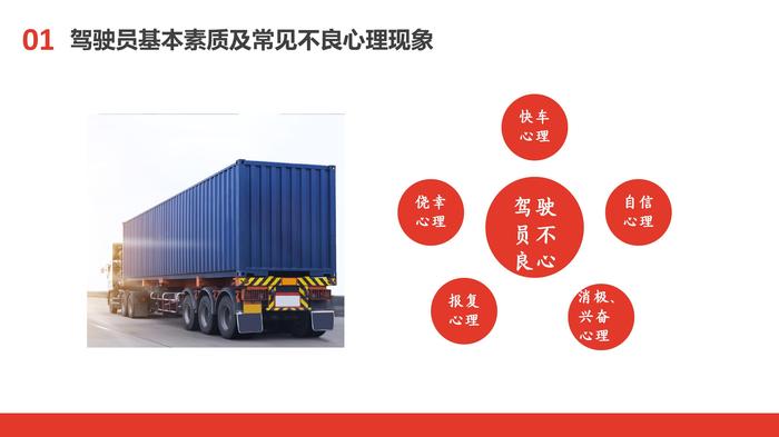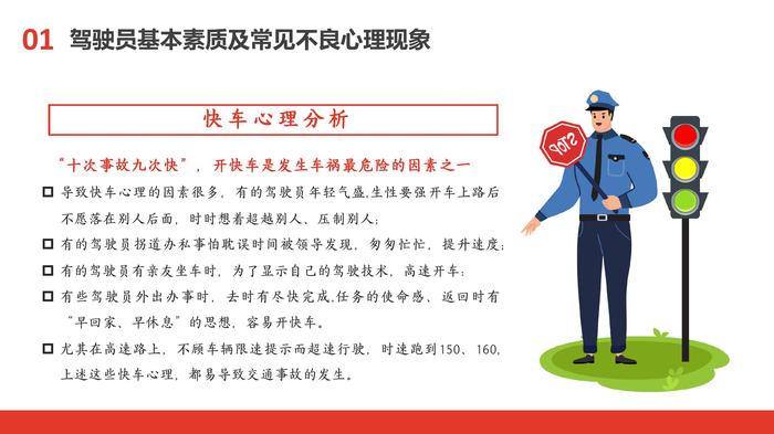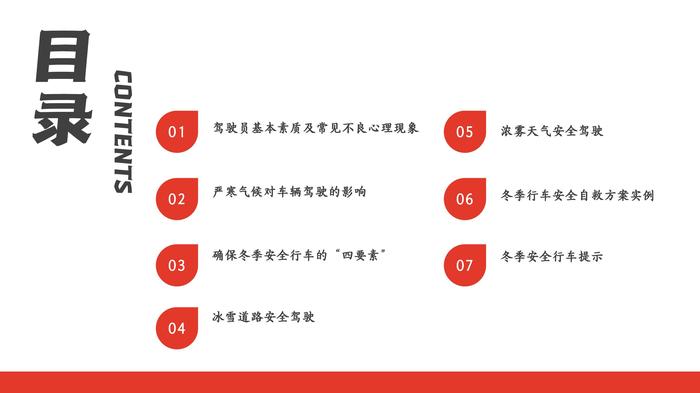 冬季行车安全教育某某交通安全大队交通安全浓雾天气安全驾驶01020304驾驶员基本素质及常见不良心理现象严寒气候对车辆驾驶的影响确保冬季安全行车的“四要素”冰雪道路安全驾驶CONTENTS目录050607浓雾天气安全驾驶冬季行车安全自救方案实例冬季安全行车提示01驾驶员基本素质及常见不良心理现象 “十次事故九次快”,开快车是发生车祸最危险的因素之一 导致快车心理的因素很多,有的驾驶员年轻气盛,生性要强开车上路后不愿落在别人后面,时时想着超越别人、压制别人; 有的驾驶员拐道办私事怕耽误时间被领导发现,匆匆忙忙,提升速度; 有的驾驶员有亲友坐车时,为了显示自己的驾驶技术,高速开车: 有些驾驶员外出办事时,去时有尽快完成,任务的使命感、返回时有“早回家、早休息”的思想,容易开快车。 尤其在高速路上,不顾车辆限速提示而超速行驶,时速跑到150、160,上述这些快车心理,都易导致交通事故的发生。 快车心理分析01驾驶员基本素质及常见不良心理现象 “难得一次,不至于那么巧”,“只一次不会有什么问题” 侥幸心理是驾驶员在驾车时虽然知道自己的驾车行为有一定的风险,但总认为灾难不会落在自己头上,“难得一次,不至于那么巧”,“只一次不会有什么问题”等等,特别是驾驶员有过几次转危为安的经历。侥幸心理就会自然形成。 在处理情况时。总是往好处想,如在超车时认为对方会给自己让路,占用对方行车路线不要紧,挤过去完全可能:在违章装载、违章操作时,认为不会出问题;在通过十字路口时觉得“一慢二看三通过”麻烦 总想快速通过;在山路转弯时,认为对面不会来车。不必减速、鸣号、靠右行等等.正是这样的心理作用,导致了交通事故的发生。侥幸心理分析01驾驶员基本素质及常见不良心理现象 报复心理在某些驾驶员身上表现得比较突出 容易使其丧失自控能力.有的驾驶员遇到不讲交通规则的行人或车辆占道后,经多次鸣笛,对方不理,便想报复对 方,在逼近对方时嘴里不但骂骂咧咧,同时做点小动作 ,企图吓唬对方或迫使对方吃点亏。 结果导致事故的发生,产生报复心理的原因主要是有些驾驶员心胸狭窄缺乏修养和职业道德。 报复心理分析01驾驶员基本素质及常见不良心理现象 这类汽车驾驶员多是一些老驾驶员 这类汽车驾驶员多是一些老驾驶员,多年没有发生事故。天长日久产生了一种自信心理,认为大江大河都能过去。 小河沟里还能翻船?因而在处理复杂路况或处理突然事件时,过于相信自己或过高估计自己的驾车水平,不注意总结经验,单凭自己的感觉。 缺乏科学判断把自己以往的经验看得尽善尽美,结果就会酿成悲剧。 自信心理分析01驾驶员基本素质及常见不良心理现象处于心情不佳,厌烦、焦急、消沉、怨恨等消极情绪 驾驶员如遇到夫妻吵架,与领导或同事闹意见、子女待业,家人生病邻里纠纷,降级处分等,处于心情不佳,厌烦、焦急、消沉、怨恨等消极情绪,往往注意力不集中或心不在,致使反应变慢,操作迟缓,遇事不能及时处理。 过度兴奋是与之相反的积极情绪状态,生活、工作中遇到值得庆幸的事心理上呈现积极表现,如乔迁新居、过年回家、朋友聚会、子女就业,升学、加薪等,由于过于度兴奋,忘乎所以,心中不能平静,行驶中自控能力降低,结果乐极生悲。 消极兴奋心理分析01驾驶员基本素质及常见不良心理现象01燃油不易蒸发汽化,混合气形成条件差,发动机不易起动。02发动机和传动系各部润滑油和润滑脂粘度增大甚至凝固,车辆起步和加速困难,操纵机件沉重。03金属、塑料、橡胶等材料,在低温下具有变脆的特性,因而机件和轮胎都容易损坏。03驾驶员的手脚容易冻僵,冬季着装又比较厚,使操作的灵活性受到影响。04驾驶室内外的温差,使挡风玻璃产生蒸汽,影响视线。05路面打滑,使转向和制动的操纵难度增大。02严寒气候对车辆驾驶的影响第二天启动发动机时,切记不能大轰油门,以防烧瓦、拉缸。起步前先用怠速升温到50摄氏度左右,便可起步,起步后要用低速挡慢行一段路待底盘运转正常后,方可加速行驶。 03确保冬季安全行车的“四要素”03确保冬季安全行车的“四要素”03确保冬季安全行车的“四要素”03确保冬季安全行车的“四要素”1404冰雪道路安全驾驶五五是在弯道坡路上行驶时 应避免随意变线,遇有情况,应提前减速,避免中途变速、停车或熄火,行驶中尽量利用发动机的牵引阻力控制车速。六六是沿着前车的车辙行驶 一般情况下,不要超车、急减速、急转弯和紧急制动。需要停车时,要提前采取措施,多换档,少制动。如路况稍有可凝,应缓慢制动停车。待察看清楚,确认安全后再继续行驶。04冰雪道路安全驾驶七七是行驶不可猛打、猛回方向 当前轮发生滑溜时,应及时松开刹车,修正方向;当后轮滑溜时,应向滑溜一方修正转向盘;当遇动力滑溜应及时抬起加速踏板;当横向滑溜车辆进入旋转状态时,不要慌乱采取措施,等车辆停稳后重新起步。八八是勤用喇叭 警告行人和其他车辆,提示自己的行车位置,两车交会时关闭防雾灯,以免给对方造成眩目感,如果对方车速较快,应主动减速让行,必要时靠边停车。 04冰雪道路安全驾驶01车况不良02观察不周03跟车过近04超会车当05转向过快06制动过急07停车不稳08眩目雪盲09起步过猛10车速过快为了避免或减少冰雪天气情况下交通事故的发
