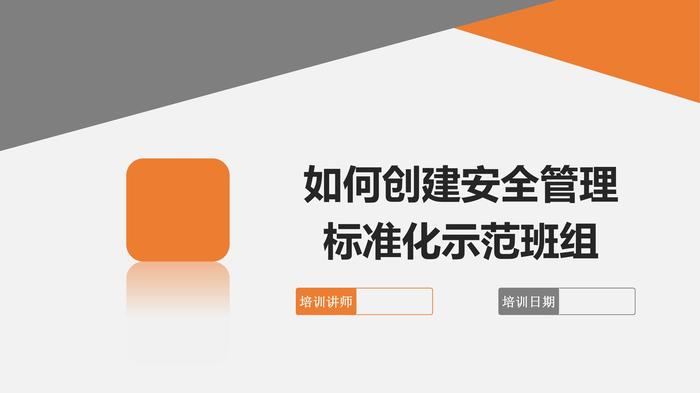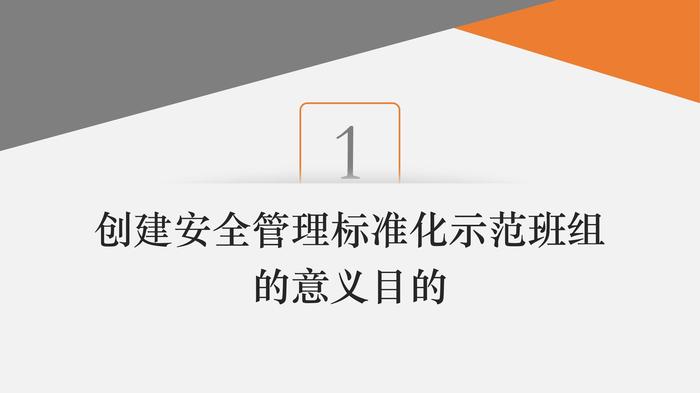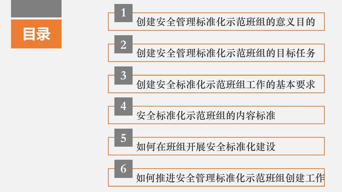 如何创建安全管理标准化示范班组培训讲师培训日期目录创建安全管理标准化示范班组的意义目的创建安全管理标准化示范班组的目标任务创建安全标准化示范班组工作的基本要求安全标准化示范班组的内容标准如何在班组开展安全标准化建设如何推进安全管理标准化示范班组创建工作1235461创建安全管理标准化示范班组的意义目的创建安全管理标准化示范班组的意义目的是落实企业安全生产主体责任的必要途径。企业是安全生产的责任主体,也是班组安全管理标准化建设的主体,要通过加强班组每个岗位和环节的安全管理标准化建设,不断提高班组安全管理水平,促进企业安全生产主体责任落实到位。是强化企业安全生产基础工作的长效制度。班组安全管理标准化建设涵盖了增强人员安全素质、提高装备设施水平、改善作业环境、强化岗位责任落实等各个方面,是一项长期的、基础性的系统工程,有利于全面促进企业提高安全生产保障水平。是有效防范事故发生的重要手段。深入开展班组安全管理标准化建设,能够进一步规范员工的安全行为,提高机械化和信息化水平,促进现场各类隐患的排查治理,推进安全生产长效机制建设,有效防范和坚决遏制事故发生,促进企业安全生产状况持续稳定好转。123班组是企业生产经营活动中的最基层单位,是企业最基础的生产管理组织,班组安全管理工作是企业安全生产工作的灵魂。班组是安全生产的第一道防线。分析告诉我们:企业80%的生产安全事故发生在现场。企业基层基础薄弱,是影响与制约安全生产的重要因素之一。要搞好企业安全工作,必须抓好班组——这个企业最基层、最基础的单元,强基固本,夯实安全基础。创建安全管理标准化示范班组的意义目的开展安全管理标准化示范班组创建活动,应遵循“安全第一、预防为主、综合治理”的方针;坚持以人为本,激发班组活力,目的是把企业班组安全建设作为基础,建设“岗位有职责、作业有程序、操作、有标准、过程有记录、绩效有考核、改进有保障”的现代化企业班组,促进企业安全生产形势持续稳定好转。创建安全管理标准化示范班组的意义目的2创建安全管理标准化示范班组的目标任务开展安全管理标准化示范班组创建活动,旨在增强员工安全素质,提高班组安全能力,规范班组安全行为、养成班组安全操作习惯,减少和杜绝“三违”现象,全面提升现场安全管理水平,逐步形成为全员所认同、共同遵守、带有本班组特点的安全价值观,塑造 “想安全、会安全、能安全”的本质安全型员工,打造“危险预知、隐患可控、机制运行有效、事故为零”的本质安全型班组,保证企业生产经营活动的顺利进行。班组安全生产主要内容主要内容包括确保人的安全、物的安全、环境安全。标志为安全、健康、卫生。 人的不安全行为的控制在于提高员工的安全意识和技 能,制止和纠正违章,完善推行标准化作业,养成有规则严格按规则做事的习惯,增强员工“安全第一、预防为主”意识,调动员工安全生产积极性,不断增强克服不安全行为的能力,提高自我保护和互保意识,做到“三关爱”、“三无”、“四不伤害”。人的安全主要内容包括确保人的安全、物的安全、环境安全。人的安全包括产品安全、生产设施设备、工具的安全,不会对生产作业人员的安全和健康造成危害。防止物的不安全状态,需要采用标准化的防护措施,经常或定期进行安全检查,以尽早发现、控制、消灭隐患,确保本质安全。环境安全标志是环境本身不受到破坏,对作业人员不造成危害。包括:作业现场安全——在易对员工造成安全健康危害之处做好明显的安全标识,以保证员工安全。生产附属物安全——采取措施排除作业过程中产生的尘埃、噪音和污染等,避免对作业人员和周边环境造成危害。班组安全生产主要内容班组现场安全管理目标和标准班组安全生产的目标就是要杜绝人身伤害事故和中毒、火灾、爆炸、坍塌等事故,消除职业危害,实现各类灾害事故为零的目标,实现班组“三无”目标,即“个人无违章,岗位无隐患,班组无事故”。每天开好班前会和班后会。班前会结合当天工作任务,做好危险点分析,布置安全措施,交待注意事项;班后会总结讲评当班工作和安全情况,表扬好人好事,批评忽视安全、违章作业等不良现象,并做好记录。基本标准班组内的机电设备、工具、车辆及工作现场等都必须做到无隐患。安全防护装置、设施齐全可靠。设备安全清洁完好,性能达到铭牌要求,无跑、冒、滴、漏。生产作业环境文明整洁,无垃圾、无油渣、无杂物、物料工具堆放整齐,安全通道畅通,安全标志明显。安全管理制度上墙,设立班组(工段)安全园地。 1234班组现场安全管理目标和标准班组现场安全管理目标和标准基本标准5678上岗前必须按规定穿戴好劳动防护用品,杜绝疲劳作业。班组内每项操作都有标准的规程,每个职工都能认真执行安全操作规程和各项规章制度,危险作业要预先组织危险辨识,实行“手指口述”操作法,无冒险蛮干,无违规操作。班组人员做到“四不伤害”(不伤害自己,不伤害他人,不被他人伤害,保护他人不受伤害)。特种作业人员从事相关操作,必须持证上岗,不得安排无证人员从事特种作业。基本标准910新上岗职工(含换新工种人员)必须培训合格方能上岗,明确专