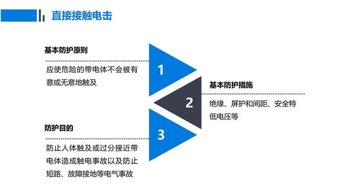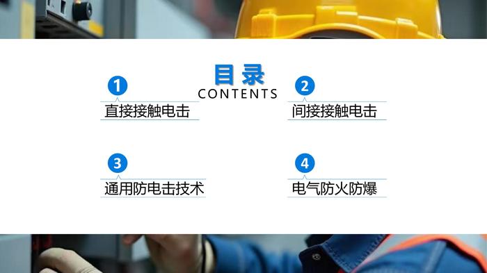 2025年电气安全专题培训直接接触电击直接接触电击绝缘 绝缘是指利用绝缘材料对带电体进行封闭和隔离。长久以来, 绝缘一直是作为防止电事故的重要措施,良好的绝缘也是保证电气系统正常运行的基本条件。 常用的绝缘材料(囚禁“电老虎”的笼子):瓷、 玻璃、云母、橡胶、木材、胶木、塑料、布、纸和矿物油等。 应当注意:在机械制造行业,绝缘失效大多是因为受到机械力损伤和绝缘材料受热变性造成的!另外,很多绝缘材料受潮后也会丧失绝缘性能,或在强电场作用下会遭到破坏,丧失绝缘性能。直接接触电击直接接触电击直接接触电击直接接触电击手持电动工具选用 具有双重绝缘和加强绝缘的设备属于Ⅱ类设备,Ⅱ类设备无须再采取接地、接零等安全措施 标志:“回”——作为Ⅱ类设备技术信息一部分 手持电动工具应优先选用Ⅱ类设备 分类的数字只表示设备防触电保护所采用的方式,并不反映设备的安全等级直接接触电击直接接触电击屏护即采用遮栏、护罩、护盖、箱体等把带电体同外界隔离开来。 电器开关的可动部分一般不能使用绝缘,而需要屏护。高压设备不论是否绝缘,均应采取屏护 护装置的种类:永久性屏护装置和临时性屏护装置;固定屏护装置和移动屏护装置直接接触电击直接接触电击遮栏高度不应低于 1.7m,下部边缘离地不应超过 0.1m栅遮栏的高度户内不应小于 1.2 m ,户外不应小于 1.5m ,栏条间距离不应大于 0.2 m 对于低压设备,遮栏与裸导体之间的距离不应小于 0.8 m 。户外变配电装置围墙的高度一般不应小于 2.5 m直接接触电击常见屏护装置: 开关的灭弧罩、胶盖、外壳 配电箱、开关柜 变配电装置遮拦、栅栏 围拦、围墙 天车滑线或母线的护网直接接触电击间距:是指带电体与地面之间,带电体与其他设备和设备与设施之间,带电体与带电体之间的必要安全距离,距离的大小取决于电压高低、设备类型、安装方式和周围环境等。是防止人体触及或接近带电体造成触电事故;防止电压放电和各种短路故障导致火灾事故,避免车辆或其他器具碰撞或过分接近带电体造成事故。直接接触电击导线与地面或水面的最小距离m 起重机具与线路导线的最小距离m 直接接触电击导线与建筑物的距离m 架空线路与铁路、公路交叉时最小距离m 直接接触电击同杆架设线路间的最小距离m 电气线路与管道间的最小距离m 直接接触电击电气检修安全距离m 导线与树木的距离m 直接接触电击直接接触电击间接接触电击间接接触电击即故障状态下的电击这种电击在电气死亡事故中约占二分之一,而这种电击尚未导致死亡的伤害在电击伤害中所占的比例要大得多。 保护接地/接零、加强绝缘、电气隔离、不导电环境、等电位联结和漏电保护都是防间接接触电击的技术措施。保护接地和保护接零是防止间接接触电击的基本技术。间接接触电击目前常见的电力供电系统有三种:IT、TT、TN。其中前两种采取的就是保护接地间接接触电击IT系统 在380V不接地低压系统中,一般要求保护接地电阻RE≤10Ω。要求RE≤4Ω在不接地的10kV配电网中,如果高压设备与低压设备公用接地装置,要求接地电阻不超过4Ω。间接接触电击IT系统保护原理 因接地电阻较小,可将漏电设备的外壳电压限制在安全范围内 人体接触漏电设备接地电阻的分流作用使漏电电流绝大部分从接地电阻通过,从而一定程度上保证了人体的安全。 RE与RP (人体电阻) 呈并联关系,且RE 远小于 RP ,∵ RE<<│Z│,∴ UP (人体电压)↓↓——在安全范围内间接接触电击间接接触电击IT系统保护原理 在设备无接地保护(无RE即RE为∞)的情况下,发生碰壳故障时人体电压?危险否?而当有RE保护时,人体电压近似取决于RE在与RN分配相电压时的分压大小,同①相比,可见危险性得到了降低。但是! 危险并未消除 IT系统的接地RE也能大幅度降低漏电设备上的故障电压,但一般不能降低到安全范围以内。因此,采用TT系统必须装设漏电保护装置或过电流保护装置,并优先采用前者间接接触电击间接接触电击间接接触电击IN系统保护原理 TN系统——将电气设备的金属外壳与工作零线相接的保护系统,也称作保护接零系统。保护接零的安全原理是当某相带电部分碰连设备外壳时,形成该相对零线的单相短路;短路电流促使线路上的短路保护元件迅速动作,从而把故障设备电源断开,消除电击危险。 虽然保护接零也能降低漏电设备上的故障电压,但一般不能降低到安全范围以内。其第一位的安全作用是迅速切断电源间接接触电击TN-S系统正常工作条件下,外露导电部分和保护导体呈零电位——最“干净”的系统间接接触电击间接接触电击通用防电击技术通用—电气隔离电气隔离的安全条件,单独的供电电源有的仅对单一设备供电,有的同时对多台设备供电。对这两种情况,从安全条件上有通用的要求,也有各自特殊的要求通用防电击技术通用—电气隔离电气隔离防护原理电气隔离实质上是将接地的电网转换为一范围很小的示接地电网。电气隔离的原理图。分析两人的触电危险性可以看出:正常情况下,由于N线(或PEN线)直接接地,使流经左侧人员的电流沿系统的工作接地和重复接地构成回路,其的危险性很大;而流经右侧人员的电流只能沿绝缘电阻和分布电容构成回路,电击的危险性可以得到抑制。通用防电击技术电气隔离通用技术要求通用