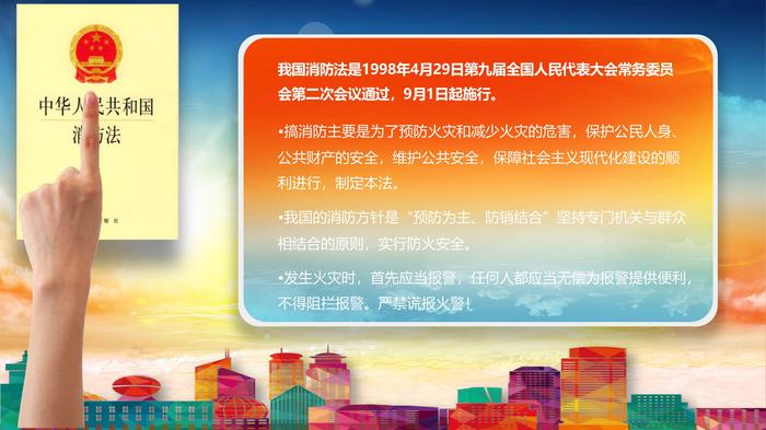 我国消防法是1998年4月29日第九届全国人民代表大会常务委员会第二次会议通过,9月1日起施行。搞消防主要是为了预防火灾和减少火灾的危害,保护公民人身、公共财产的安全,维护公共安全,保障社会主义现代化建设的顺利进行,制定本法。 我国的消防方针是“预防为主、防销结合”坚持专门机关与群众相结合的原则,实行防火安全。 发生火灾时,首先应当报警,任何人都应当无偿为报警提供便利,不得阻拦报警。严禁谎报火警!消防安全法规要求消防安全要求消防安全要求消防安全要求火灾预防的基本概念火灾预防的基本概念燃烧的基本条件灭火的基本方法灭火的基本方法隔离法:即将燃烧物或燃烧物附近的可燃物质隔离或移开,不使火势蔓延而终止其燃烧,从而使火熄灭。 冷却法:就是降低燃烧物的温度,使温度低于燃烧点,火就会熄灭。 窒息法:阻止空气流入燃烧区域或用不燃烧的物质冲淡 空气,使燃烧物得不到足够的氧气而熄灭。 火灾种类火灾种类A:凡由木材、纸张、棉、布、塑胶等固体物质所引起的火灾。 B:凡由引火性液体及固体油脂物体所引起的火灾,如汽油、石油、煤油等。 C:凡是由气体燃烧、爆炸引起的火灾都称为气体火灾,如天然气、煤气等。 D:凡钾、钠、镁、锂及禁水物质引起的火灾。 E:凡是由电器走火漏电打火引起的火灾称为电气火灾。发生火灾时怎么办发生火灾时怎么办灭火剂分类灭火剂分类A.水(主要适用于A类火灾)灭火剂分类下列物质不能用水扑救碱金属(钾、钠等)发生火灾时不能用水扑救。因 为水与碱全属作用后能生成大量的氢,容易引起爆炸。 碳化钙(电石)不宜用水扑救,遇水会生成乙炔气、有引起爆炸的危险。 三酸(硫酸、硝酸、盐酸)不宜用强大水流去扑救,因为酸近水能引起酸的飞溅、爆炸和伤人,必要时可用喷雾水扑救。 轻于水的易燃液体从原则上说不可以用水扑救,但原油、重油等都可以用喷雾水扑救,还有一部分能溶解于水的可燃液体也可以喷雾水稀释它(如乙二醇等)。 熔化了的铁水、钢水也不能用水扑救,因为在高温情况下能使水迅速蒸发井分解出氢和氧引起爆炸。灭火剂分类B.二氧化碳灭火器(适用于A、B、C类火灾)灭火剂分类C.干粉灭火器(适用于A、B、C类火 灾或B、C类火灾)灭火剂分类D. 1211灭火器(适用于A、B、C、E类火灾)灭火器的使用方法灭火器的使用方法左手紧握鸭舌把,右手把拉环迅速抽出, 随即右手拿起喷嘴做好准备灭火的动作;左手将灭火器提起后用力向下压把手, 右手拿起喷嘴对准火源进行喷洒;人站在火势之上风处灭火, 从着火区域边缘开始渐进灭火。使用二氧化碳灭火器时, 要手握橡胶喷管,防止造成冻伤。消防栓与水带 的使用方法消防栓与水带的使用方法消防栓箱的门子一般由玻璃制作,紧急情况下可击碎玻璃取出水带,甩开水带后一端接水枪,一端连接消防栓,技术要求是对准卡口,顺时旋转45度,带子不够长度时,可另取一条按上述方法连接。救火常识知识救火常识知识 扑救室内火灾一般不要先开门窗救火常识知识救火时怎样避免人多手脚乱 救火常识知识扑灭小火 惠及他人救火常识知识身上着火怎么办? 救火常识知识火场上怎样防爆?火场人员抢救火场人员抢救火场上怎样救人?救人重于救火。如下七种“救人术”十分有效: 火场逃生术火场逃生术熟悉环境 暗记出口 倘若你来到陌生的地方,特别是在商场、宾馆等庞大建筑物中,为了自身的安全,必须留心一下太平门及疏散通道的位置,楼梯的方位等,以便一旦遇到火灾险情的时候,不至于迷失方向而盲目地往火海里闯,往死胡同里钻。一定要给自己找一条逃生之路。火场逃生术保持冷静 寻路逃生 当楼房突然发生火灾时,首先要强令自己保持镇静,切不可惊惶失措,以免做出错误的决断而冒险跳楼。逃生的路线要注意,朝有照明或明亮处迅速撤离;若在楼梯上,应选择往下跑,若被火档住,就要通过窗口或阳台等往外逃生。火场逃生术毛巾妙用 过滤烟素 据有关资料统计,在火灾中丧生的人,受烟雾中素、窒息而死亡的比例远比烧死的要高,大约比率高达70%以上,因此,当你被烟困住时,防烟雾中毒、防窒息死亡是非常重要的。我们日常生活中的毛巾要顺手捡来须知空气过滤器,人在烟雾中,用折叠8层的湿毛巾蒙鼻保护,可减少60%烟雾毒气的吸入。 火场逃生术明辨方向 逃离火场 你在跑离火场时,千万不要在弄不清方向的情况下乱跑,如普通楼梯一旦跑进去就遇上断电,就等于钻进死亡的“囚笼”;同时也不可躲入床下或壁柜中,这样会令救援者难以发现。正确有选择是:沿烟气不浓、大火尚未烧及的楼梯,应急疏散通道,楼外附设敞开式楼梯等往下跑,一旦在下跑的过程中受到烟火或人为封堵,应从水平方向选择其它通道,或临时退守到房间及避难层内争取时间,进而采用其它方法逃生。 火场逃生术烟雾场所 匍匐前进 化学装饰材料燃烧时散发出的有毒气体,随着浓烟快于人奔跑速度的4-8倍迅速蔓延,即使不烧死,也会因烟雾毒气而窒息死亡。所以,当烟雾太浓时,可以用毛巾或湿布捂住口鼻,屏住呼吸,防止烟雾毒气呛入体内。同样,宜俯卧爬行,因烟气及毒气比空气轻,贴近地面的空气,一般比较清洁少烟,且含氧量较多,可避免被毒烟熏倒而窒息。火场逃生术结绳自救 脱离险境 如果火灾发生时安全通道被堵,求援人员又不能不能及时赶到,情况万分危