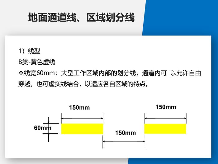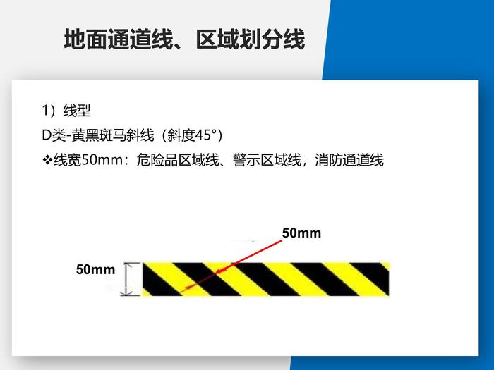 车间安全标识与距离图解地面通道线、区域划分线1)线型 A类-黄色实线 线宽60mm:原则上用于物品的定位线; 线宽80mm:原则上用于设备的区域线; 线宽120mm:原则上用于主通道线。 1)线型 B类-黄色虚线 线宽60mm:大型工作区域内部的划分线,通道内可 以允许自由穿越,也可虚实线结合,以适应各自区域的特点。地面通道线、区域划分线1)线型 A类-黄色实线 线宽60mm:原则上用于物品的定位线; 线宽80mm:原则上用于设备的区域线; 线宽120mm:原则上用于主通道线。 1)线型 C类-红色虚线 线宽60mm:不良品摆放区的划分线(碰到三面围墙处,第四面地面划一条红色实线)。地面通道线、区域划分线1)线型 A类-黄色实线 线宽60mm:原则上用于物品的定位线; 线宽80mm:原则上用于设备的区域线; 线宽120mm:原则上用于主通道线。 1)线型 D类-黄黑斑马斜线(斜度45°) 线宽50mm:危险品区域线、警示区域线,消防通道线50mm地面通道线、区域划分线1)线型 A类-黄色实线 线宽60mm:原则上用于物品的定位线; 线宽80mm:原则上用于设备的区域线; 线宽120mm:原则上用于主通道线。 2)定位线 A类-设备的定位 所有设备与工作台的定位均用黄色四角定位线,工作台的四角定位线的内空部分注明“XX工作台/设备”字样。20cm地面通道线、区域划分线1)线型 A类-黄色实线 线宽60mm:原则上用于物品的定位线; 线宽80mm:原则上用于设备的区域线; 线宽120mm:原则上用于主通道线。 2)定位线 B类-不良品区(废弃物的回收桶、箱、不良品放置架)定位 用红色线,如果定位范围小于40cm×40cm,则直接采用封闭实线框定位5cm不良品区地面通道线、区域划分线1)线型 A类-黄色实线 线宽60mm:原则上用于物品的定位线; 线宽80mm:原则上用于设备的区域线; 线宽120mm:原则上用于主通道线。 2)定位线 C类-消防器材、油类、化学品等危险物品的的定位 使用红白警示定位线。地面通道线、区域划分线1)线型 A类-黄色实线 线宽60mm:原则上用于物品的定位线; 线宽80mm:原则上用于设备的区域线; 线宽120mm:原则上用于主通道线。 2)定位线 D类-物料码放架与形状规则的常用物品、所有可以移动或容易移动的设备的定位。 使用黄色四角定位线。地面通道线、区域划分线1)线型 A类-黄色实线 线宽60mm:原则上用于物品的定位线; 线宽80mm:原则上用于设备的区域线; 线宽120mm:原则上用于主通道线。 2)定位线 E类-货架的定位地面通道线、区域划分线1)线型 A类-黄色实线 线宽60mm:原则上用于物品的定位线; 线宽80mm:原则上用于设备的区域线; 线宽120mm:原则上用于主通道线。 2)定位线 F类-开闭门线地面通道线、区域划分线1)线型 A类-黄色实线 线宽60mm:原则上用于物品的定位线; 线宽80mm:原则上用于设备的区域线; 线宽120mm:原则上用于主通道线。 2)定位线 G类-警示范围线 设置在墙面的消防栓;配电柜、配电箱、电气控制柜等;提醒作业操作注意的区域、提醒行走注意的区域、提醒碰头的部位等;地面通道线、区域划分线1)线型 A类-黄色实线 线宽60mm:原则上用于物品的定位线; 线宽80mm:原则上用于设备的区域线; 线宽120mm:原则上用于主通道线。 2)定位线 H类-物品定位线(台面) 待加工零件、已加工零件、作业工具,检查工具、记录表、小物盒1cm1)线型 A类-黄色实线 线宽60mm:原则上用于物品的定位线; 线宽80mm:原则上用于设备的区域线; 线宽120mm:原则上用于主通道线。 1、管道色环三要素: (1)识别色,(2)介质名称,(3)流向 2、所有管道标识都必须注明识别色、介质名称和流向。在有些特别的管道管道还须注明压力、流速等,如消防管道还要注明消防专用等。管道标识1)线型 A类-黄色实线 线宽60mm:原则上用于物品的定位线; 线宽80mm:原则上用于设备的区域线; 线宽120mm:原则上用于主通道线。 管道标识1)线型 A类-黄色实线 线宽60mm:原则上用于物品的定位线; 线宽80mm:原则上用于设备的区域线; 线宽120mm:原则上用于主通道线。 管道标识电线管道:蓝色 空气管道:灰色 热水管道:红色 污水管道:黑色 自来水管道:绿色 此外还有:除尘器管道、砂输送管道、洗澡用管道(上水、回水)、暖气、饮用水管道等1)线型 A类-黄色实线 线宽60mm:原则上用于物品的定位线; 线宽80mm:原则上用于设备的区域线; 线宽120mm:原则上用于主通道线。 管道标识1)线型 A类-黄色实线 线宽60mm:原则上用于物品的定位线; 线宽80mm:原则上用于设备的区域线; 线宽120mm:原则上用于主通道线。 管道标识1)线型 A类-黄色实线 线宽60mm:原则上用于物品的定位线; 线宽80mm:原则上用于设备的区域线; 线宽120mm:原则上用于主通道线。 管道标识1)线型 A类-黄色实线 线宽60mm:原则上用于物品的定位线; 线宽80mm:原则上用于设备的区域线; 线宽120mm:原则上用于主通道线。 安全距离仓库1)线型 A类-黄色实线 线宽60mm:原则上用于物品的定位线; 线宽80mm:原则上用于设备的区域线; 线宽120mm:原则上用于主通道线。 安全距离疏散指示标志的距离1)线型 A类-黄色实线 线宽60mm:原则上用于物品的定位线; 线宽80mm:原则上用于设备的区域线; 线宽120mm:原则上用于主通道线。 安全距离商业企业疏散安全距离1)线型 A类-黄色实线 线宽60mm:原则上用于物品的定位线; 线宽80mm:原则上用于设备的区域线; 线宽120mm:原则上用于主通道线。 安全距离液化气钢瓶安全距离1)线型 A类-黄色实线 线宽60mm:原则上用于物品的定位线; 线宽80mm:原则上用于设备的区域线;