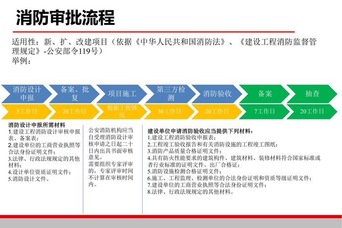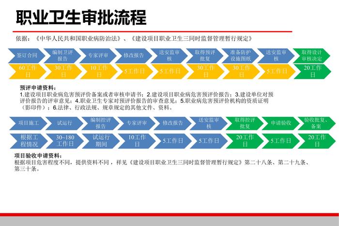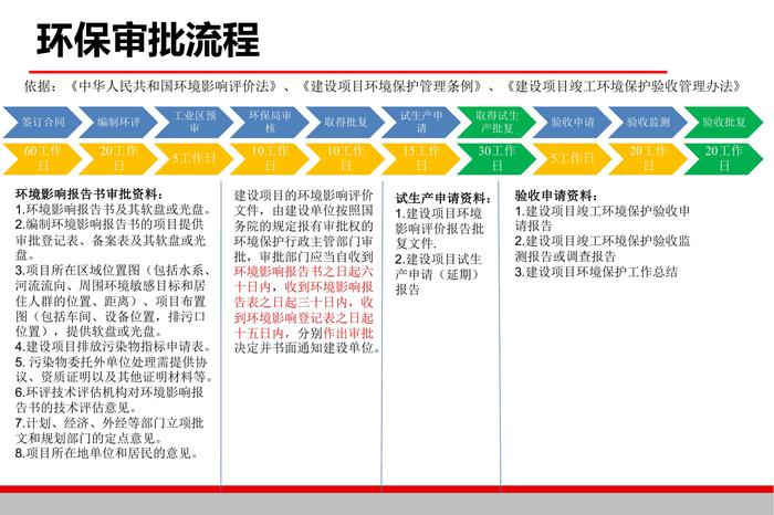 项目三同时 环保审批流程依据:《中华人民共和国环境影响评价法》、《建设项目环境保护管理条例》、《建设项目竣工环境保护验收管理办法》建设项目的环境影响评价文件,由建设单位按照国务院的规定报有审批权的环境保护行政主管部门审批,审批部门应当自收到环境影响报告书之日起六十日内,收到环境影响报告表之日起三十日内,收到环境影响登记表之日起十五日内,分别作出审批决定并书面通知建设单位。环境影响报告书审批资料: 1.环境影响报告书及其软盘或光盘。 2.编制环境影响报告书的项目提供审批登记表、备案表及其软盘或光盘。 3.项目所在区域位置图(包括水系、河流流向、周围环境敏感目标和居住人群的位置、距离)、项目布置图(包括车间、设备位置,排污口位置),提供软盘或光盘。 4.建设项目排放污染物指标申请表。 5. 污染物委托外单位处理需提供协议、资质证明以及其他证明材料等。 6.环评技术评估机构对环境影响报告书的技术评估意见。 7.计划、经济、外经等部门立项批文和规划部门的定点意见。 8.项目所在地单位和居民的意见。试生产申请资料: 1.建设项目环境影响评价报告批复文件. 2.建设项目试生产申请(延期)报告验收申请资料: 1.建设项目竣工环境保护验收申请报告 2.建设项目竣工环境保护验收监测报告或调查报告 3.建设项目环境保护工作总结消防审批流程适用性:新、扩、改建项目(依据《中华人民共和国消防法》、《建设工程消防监督管理规定》-公安部令119号) 举例:消防设计申报所需材料 1.建设工程消防设计审核申报表、备案表; 2.建设单位的工商营业执照等合法身份证明文件; 3.法律、行政法规规定的其他材料; 4.设计单位资质证明文件; 5.消防设计文件。公安消防机构应当自受理消防设计审核申请之日起二十日内出具书面审核意见。 需要组织专家评审的,专家评审时间不计算在审核时间内。建设单位申请消防验收应当提供下列材料: 1.建设工程消防验收申报表; 2.工程竣工验收报告和有关消防设施的工程竣工图纸; 3.消防产品质量合格证明文件; 4.具有防火性能要求的建筑构件、建筑材料、装修材料符合国家标准或者行业标准的证明文件、出厂合格证; 5.消防设施检测合格证明文件; 6.施工、工程监理、检测单位的合法身份证明和资质等级证明文件; 7.建设单位的工商营业执照等合法身份证明文件; 8.法律、行政法规规定的其他材料。职业卫生审批流程预评申请资料: 1.建设项目职业病危害预评价备案或者审核申请书;2.建设项目职业病危害预评价报告;3.建设单位对预评价报告的评审意见;4.职业卫生专家对预评价报告的审查意见;5.职业病危害预评价机构的资质证明(影印件);6.法律、行政法规、规章规定的其他文件、资料。依据:《中华人民共和国职业病防治法》、《建设项目职业卫生三同时监督管理暂行规定》项目验收申请资料: 根据项目危害程度不同,提供资料不同 ,祥见《建设项目职业卫生三同时监督管理暂行规定》第二十八条、第二十九条、第三十条。