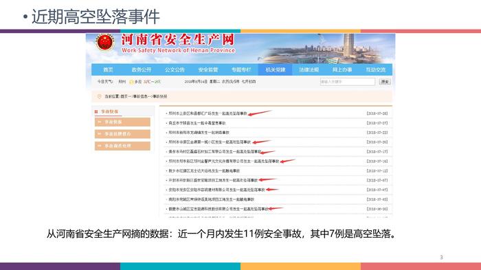 目录21高空作业危险源分析通信线路登高作业安全操作规范高空作业的定义及分类2345通信铁塔登高作业安全操作规范近期高空作业事故及分析6高空作业十不准近期高空坠落事件 3从河南省安全生产网摘的数据:近一个月内发生11例安全事故,其中7例是高空坠落。事故分析4 高空作业事故屡屡发生,而发生的原因都有什么?这个是值得大家深思和解决的问题: 安全第一,绝对不是发生事故后用的口号,而更应该是渗入日常工作管理的每一个小细节。 1、作业前未对设备安全状况进行检查。 2、工作平台没有故障(安全防护设施不安全)。 3、未使用防护设备。 4、工人在无警界(防护围栏)地带交叉作业。 5、低级错误!违反作业程序。 违反国家法律法规及高处作业标准规范!高空作业的定义 所谓高处作业是指人在距离地面为基准的高处进行的作业。国家标准 《高处作业分级》 (GB/T3608-2008)规定:“凡在坠落高度基准面2m以上(含2m)进行作业,都称为高处作业。”根据这一规定,在我们日常的空调安装(维修)、广告牌安装、建筑施工过程中涉及到高处作业的范围是相当广泛的。。 5高空作业的分类 (一)临边作业 :作业现场中,工作面边沿无围护设施或围护设施高度低于80cm时的高处作业。 (二)洞口作业 :孔、洞口旁边的高处作业,包括作业现场及通道旁深度在2m及2m 以上的桩孔、沟槽与管道孔洞等边沿作业。 (三)攀登作业:借助建筑结构或脚手架上的登高设施或采用梯子或其他登高设施在 攀登条件下进行的高处作业。 (四)悬空作业:在周边临空状态下进进行高处作业。其特点是在操作者无立足点或无牢靠立足点条 件下进行高处作业。 (五)交叉作业:在施工现场的上下不同层次,于空间贯通状态下同时进行的高处作业。6高空作业危险源分析7高空作业危险源分析8通信线路登高作业安全操作规范 通信线路登高作业安全操作规范 9通信线路登高作业安全操作规范作业人员 登高作业人员必须经特种作业培训合格后持证上岗,同时必须取得电信通信作业安全培训合格证。 从事高处作业人员在身体不适或患病期间,不准进行高处作业。 严禁酒后登高。 劳动保护穿戴齐全,作业工具完好牢固。 10不得用线材或绳索代替脚扣带。 作业前,必须对线缆及附件、设备先使用测电笔验电; 通信铁塔登高作业安全操作规范 通信线路登高作业安全操作规范 同一杆挡的一条吊线上,不准有两辆滑车(吊板)同时作业。 在作业前及作业中,一旦发现可能危害到人身安全的情况时,现场作业负责人或安全责任人有权停止作业、指挥人员撤离作业现场,并做好现场的监护措施。 遇有六级以上强风或暴雨、大雪、浓雾、雷电、冰雹 安全带应固定在距杆梢0. 通信铁塔登高作业安全操作规范 等恶劣气象条件时,应立即停止室外高处作业。 脚扣的踏脚板必须经常检测,其方法是:在踏脚板中心悬吊200kg重物。 登塔作业人员每年至少详细检查身体一次。 安全带:必须符合国家标准,确保安全可靠且在有效期内,如有折断痕迹、弹簧扣不灵活、扣不牢、皮带眼孔裂缝、保险锁扣失效、安全带磨损和断头超过1/10的禁止使用; 不得用线材或绳索代替脚扣带。 下塔时和上梯相反程序,双手扶稳上部构件,先下一只脚踩稳后再踩第二步,通信线路登高作业安全操作规范天气、环境 遇有六级以上强风或暴雨、大雪、浓雾、雷电、冰雹 等恶劣气象条件时,应立即停止室外高处作业。 霜冻和雨雪天气后上杆必须采取防滑措施。 在高压线下方或附近进行作业时,作业人员的身体(含超出身体以外的金属工具或物件)距高压线及电力设施最小间距应保持:1~35kV的线路为2.5米;35kV以上的线路为4米。 在220V、380V的电力线附近作业时,作业人员与电力线最小间距为0.6米,并应做好相应防护措施。 11通信线路登高作业安全操作规范作业工、器具 竹梯:必须坚实并有橡皮包脚(15公分)防滑措施,竹梯的首末二档处及中间每隔四、五档必须用线径合适的铁丝来回4至6道捆扎绞紧,并将梯子底部120公分漆上红白的标志(三红三白)。 脚扣:外形及附件确保完好;胶管、胶垫及齿牙必须保持完好,对已磨损、破裂或露出胶里线的必须更换;脚扣的踏脚板必须经常检测,其方法是:在踏脚板中心悬吊200kg重物。 A字梯:必须结构牢固,搭扣完好,具有绝缘防滑措施,在用机房严禁使用金属材质A字梯。 滑车(吊板):必须部件完整,结构牢固;保险装置必须有效,吊板的绳索、吊钩必须牢固,如吊钩已磨损1/4时,不准使用。 伸缩梯:必须配件齐全,结构牢固,伸拉自如,梯脚有绝缘防滑胶脚。在用机房严禁使用金属材质伸缩梯。 12通信线路登高作业安全操作规范作业工、器具 安全带:必须符合国家标准,确保安全可靠且在有效期内,如有折断痕迹、弹簧扣不灵活、扣不牢、皮带眼孔裂缝、保险锁扣失效、安全带磨损和断头超过1/10的禁止使用;安全带的绳索不能有接头;安全带应妥善保管,不准与酸性物质、锋刃工具一起堆放和保管,不准放在火炉边、暖气片旁或潮湿处。 安全帽:必须符合国家标准,确保安全可靠且在有效期内。严禁使用帽壳破损、缺少帽衬(帽箍、顶衬、后箍)、缺少下颚带等的安全帽。 安全吊绳:必须确保安全可靠,不能有霉变、断股、损伤,不可打死结。应妥善保管,不准与酸性物质、锋刃工具一起堆放和保管,不准放在火炉边、暖气片旁或潮湿处。 