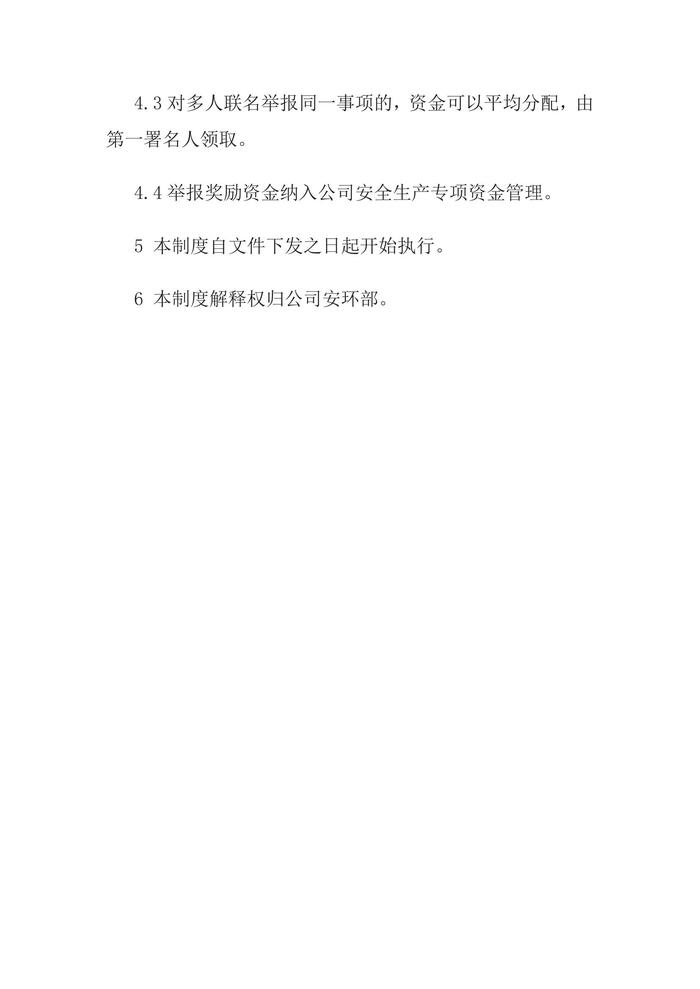 公司事故隐患内部报告奖励机制为充分调动公司职工参与安全生产工作的积极性,及时发现和消除事故隐患,有效预防各类事故的发生,最大限度地减少安全风险,逐步形成安全生产工作的长效机制,特制定本奖励制度。1 总则1.1本公司区域内事故隐患举报奖励活动适用本制度。1.2事故隐患举报奖励工作由公司安环部负责。1.3任何部门和个人有权对其发现的生产安全事故隐患进行举报,并获得一定奖励。1.4举报实行严格的保密制度。安环部要妥善保管和使用举报材料,不对外泄露举报人的任何信息。调查核实情况时,不出示举报材料原件或复印件,不得将举报情况透露给被举报部门或有可能对举报人产生不利后果的其他人员和部门。1.5举报的事故隐患应当真实,不得捏造、歪曲事实,不得诬告、陷害他人。对借举报之名捏造事实、诬告他人或者以举报为名干扰正常工作的,将追究举报人的责任。2 举报范围2.1生产、使用、存储、发运过程中安全装备、安全设施的事故隐患。2.2生产、使用、存储、发运过程中管理类的事故隐患。2.3工程施工过程的事故隐患及安全生产违法行为。2.4火灾事故隐患。2.5食品卫生安全隐患。2.6公司办公楼、职工宿舍等场所可能引起人员伤亡或财产损失的事故隐患。2.7依照法律、法规、公司规章制度责令限期改正、停产整顿的部门、施工现场,逾期未改、未停而继续违法从事生产活动的隐患。2.8各类未按规定上报、隐瞒不报的生产安全事故。2.9安全制度、安全措施不健全可能导致的生产安全隐患。3 举报和受理:3.1举报人可以采取书信、电话、短信等多种形式向安环部报告。3.2举报人在举报时应提供本人真实姓名、所属部门及联系方式。3.3举报人的举报应有事故隐患的详细情况。3.4安环部设立专门的举报电话接受举报,并保持通信畅通。举报电话:8029。3.5安环部工作人员要严格为举报者保密。凡向被举报人或部门泄漏举报者的工作人员,要严肃查处。3.6接到举报后,要建立举报事故隐患整改台帐,对照公司隐患整改台账,确认是否属于未发现新的隐患。3.7必须及时将所举报的事故隐患通知相关的部门,组织进行处理。4 举报奖励实施:4.1对举报事故隐患经查证属实且属于未发现的一般事故隐患,奖励举报人50元,属于未发现的重大事故隐患,奖励举报人100元。4.2事故隐患报告和举报奖励实行一次一奖励,对一次举报多个事故隐患的,按一次奖励,奖励标准就高不就低。4.3对多人联名举报同一事项的,资金可以平均分配,由第一署名人领取。4.4举报奖励资金纳入公司安全生产专项资金管理。5 本制度自文件下发之日起开始执行。6 本制度解释权归公司安环部。