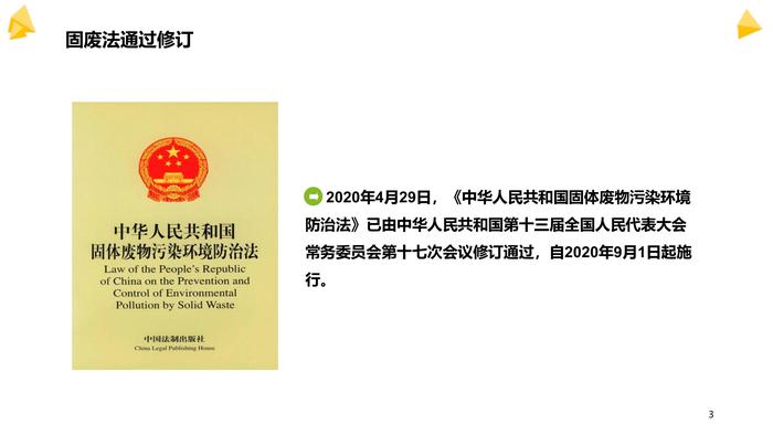 1固体废物污染防治管理培训2目录01020304固废法的修订修订固废法的简要历程主要变化企业需要特别关注的规定 2020年4月29日,《中华人民共和国固体废物污染环境防治法》已由中华人民共和国第十三届全国人民代表大会常务委员会第十七次会议修订通过,自2020年9月1日起施行。固废法通过修订301修订固废法的背景4一是修订固废法的背景固体废物污染环境防治是打好污染防治攻坚战的重要内容,事关人民群众生命安全和身体健康。全国人大常委会于2017年度开展了执法检查工作,建议尽快启动修订工作。十三届人大常委会专门听取审议国务院关于研究处理固废法执法检查报告及审议意见情况的报告,在关于全面加强生态环境保护依法推动打好污染防治攻坚战的决议中明确提出加快固废法的修改工作。567对贯彻落实生态文明思想和党中央有关决策部署,推进生态文明建设,打赢污染防治攻坚战具有重大意义,非常必要。特别是在当前抗击新冠肺炎疫情的关键时期,修订固废法,完善对工业固体废物、包括医疗废物在内的危险废物,以及生活垃圾建筑垃圾等固体废物的管理制度,非常及时。二是依法打好污染防治攻坚战的迫切需要8体现了新形势下固体废物污染环境防治成功经验,突出问题导向,回应公众期待,满足实践需求,健全长效机制,制度规范可行,用最严格制度最严密法治保护生态环境,对加强疫情防控,打赢污染防治攻坚战,必将发挥积极作用。三是对前期成功经验的总结902修订固废法的简要历程10修订固废法的简要历程2004年12月1995年10月30日第八届全国人民代表大会常务委员会第十六次会议通过,自1996年4月1日施行。于2004年做过一次修订,2013、2015和2016就部分条款做过修改,2020年修订。2013年6月2015年4月2016年11月2020年4月111203主要变化131. 加强医疗废物监管一、十大亮点《固废法》增加了对医疗废物的监管要求1401推广使用可重复使用的医疗用品鼓励医疗机构采用可重复使用的医疗器械、器具和物品,减少一次性医疗用品的使用。02实施医疗废物分类管理将医疗废物分为感染性、损伤性、病理性、化学性和药物性等五类,进行分类收集、包装和标识。03加强医疗废物暂存管理医疗机构应设立专门的医疗废物暂存间,并指定专人负责管理,确保医疗废物在暂存期间的安全。2.逐步实现固体废物零进口一、十大亮点 为进一步贯彻落实中央改革精神,为全面禁止“洋垃圾”入境改革提供法律保障,《固废法》第二十四条规定“国家逐步基本实现固体废物零进口,由国务院生态环境主管部门会同国务院商务、发展改革、海关等主管部门组织实施。”153. 加强生活垃圾分类管理一、十大亮点 实践证明,垃圾分类作为推进生活垃圾减量化、资源化、无害化的主要手段之一,是防治环境污染的重要举措。《固废法》为加强生活垃圾分类管理提供了法治保障。164. 限制过度包装和一次性塑料制品使用一、十大亮点 近年来,伴随网购和外卖的风行,过度包装和一次性塑料制品使用问题比较突出。据国家邮政局公布的数据显示,2019年中国快递业务量突破600亿件,同比增长26.6%,仅快递所耗胶带就可以缠绕地球1200余圈。17 5. 推进建筑垃圾污染防治一、十大亮点 未来,随着加速推进城镇化的进程,建筑垃圾总量会越来越多,建筑垃圾的资源化利用工作亟须推进。《固废法》加大推进建筑垃圾污染环境防治工作的力度,增加了相关规定。18 6. 完善危险废物监管制度一、十大亮点由于危险废物带来长期的环境污染和潜在的环境影响,社会公众对危险废物问题十分关注。《固废法》回应社会公众的关切,对危险废物监管制度进行了完善。19 7. 取消固废防治设施验收许可一、十大亮点深入贯彻落实“放管服”改革精神,根据《环境影响评价法》和《建设项目环境保护管理条例》的新要求,取消了对固体废物污染防治设施验收实施的行政许可,改为建设单位自主验收。20 8. 明确生产者责任延伸制度一、十大亮点生产者责任延伸制度(Extended Producer Responsibility,简称EPR),是指将生产者对其产品所承担的环境责任从生产环节延伸到产品设计、流通消费、回收利用、废物处置等全生命周期的制度。219. 推行全方位保障措施一、十大亮点《固废法》专门增设“保障措施”一章,作为第七章,系统规定强制保险、资金安排、政策扶持、金融支持、税收优惠、绿色采购等保障措施。2210. 实施最严格法律责任一、十大亮点《固废法》在法律责任这一章,从过去共21条,增加到现在共23条,增加了处罚种类,提高了罚款额度,对违法行为实行严惩重罚。2304企业需要特别关注的规定24(一)固废法的特点固废法不同于《水污染防治法》、《大气污染防治法》等其他环保单行法之处在于,它不只是一部为排污单位设置环境管理义务和责任的法律。固废法对企业的影响实际渗透到了企业运营的全过程,甚至可以改变一家企业的盈利模式。比如,固废法明确规定,国家逐步实现固体废物零进口。对于造纸行业来讲,废纸是除木浆外应用较为广泛的一种造纸原料, 而目前许多企业的废纸原料多半依靠进口。“固体废物零进口”的要求和国内废纸质量较差的现状,必然需要企业在发展战略上作出一些预判和部署。25(一)固废法的特点另外,固废法在对环境违法行为的“严惩重罚”方面也达到了新高度,多项违法行为的罚