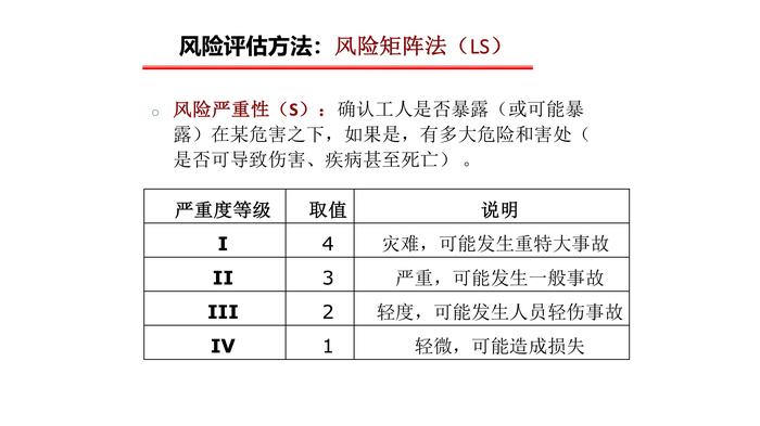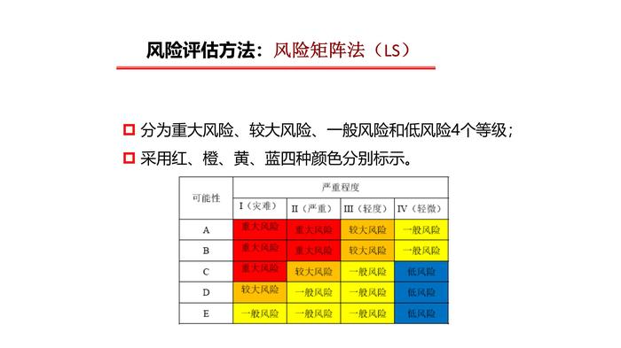 风险矩阵法给出了两个变量,分别表示风险发生的可能性(L)和后果(S)。判定危害可能产生的后果以及产生这种后果的可能性,二者相乘,得出其风险值及风险等级。风险评估方法:风险矩阵法(LS)风险可行性(L):依据发生的可能性,来估计每种危险的概率,并指定相应的量化值。风险评估方法:风险矩阵法(LS)风险严重性(S):确认工人是否暴露(或可能暴露)在某危害之下,如果是,有多大危险和害处(是否可导致伤害、疾病甚至死亡) 。风险评估方法:风险矩阵法(LS) 分为重大风险、较大风险、一般风险和低风险4个等级; 采用红、橙、黄、蓝四种颜色分别标示。风险评估方法:风险矩阵法(LS)