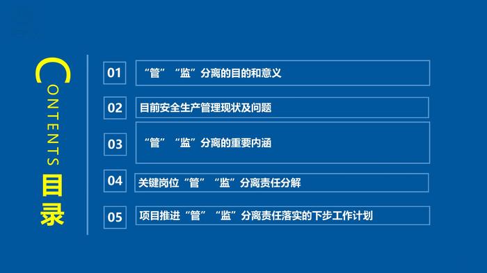安全生产责任制 之 推进“管”“监”分离责任落实浅析C目 录ONTENTS“管”“监”分离的目的和意义01明晰 新时期安全生产工作新路径或新机制调动 各级领导、部门和各层级干部拓展思路破除 惯性思维与传统管理中存在的弊端推进 目的目的转变 由传统的管监混淆模式转变为更加科学 的管监责任明晰的综合治理模式意义实现“安全”供给侧改革实现“安全”换挡提速实现“安全”转型增效实现向本质安全的管理升级实现由治标为主向治本为主转变实现系统岗位责任的再落实安全生产管理体系现状及问题02制度:较为完善、落实不力(一)体系及运行1、总体概况1、机构与人员要求 2、标准化建设要求 3、日常安全检查(稽查)活动要求 4、重点领域卡控专项要求 5、事故报告及应急救援要求 6、培训教育要求 7、责任追究与经济处罚要求 8、安全质量创优及环境保护要求 9、考核评价要求制度:较为完善、落实不力根本原因: 项目管理粗放、管理随意、散漫,未养成刚性执行的约束 让步接受。(一)体系及运行1、总体概况2、体系运行评价传承、基础,习惯 框架已经形成管监一体,职责不清 对监管部门依赖大 检查频繁,浪费资源,干扰施工 安全生产业绩波动起伏、难有新提升 优势弊端(一)体系及运行(二)现状和问题04030201领导层面部门层面项目层面1、现状全员层面安全 生产问题 现状劳动力素质不高施工方案落实不到位“三违“屡禁不止工序风险识别与卡控不到位2、问题(二)现状和问题劳动力 素质不高2、问题(二)现状和问题分包管理难度大,漏洞多 作业人员自我保护意识差作业人员违章图片坍塌事故2、问题(二)现状和问题风险辨识、动态跟进不认真 施工措施不联系实际 不检查落实情况 不组织人员培训某铁路隧道进口洞外边坡滑塌事故某工程挡土墙边坡滑塌事故2、问题(二)现状和问题管理力量不足 人员素质不高 风险识别能力不强 具体措施不力“三违“ 屡禁不止2、问题(二)现状和问题安全教育培训覆盖不到位,内容简单重复 “最后一公尺”不受控2015某项目窒息事故 改革创新与安全密切相关“监”“管”分离责任落实的重要内涵03(一)明晰责任、深刻理解“管”“监”责任差异组织指挥12技术保障3资源配置4安质监督(一)明晰责任、深刻理解“管”“监”责任差异组织指挥12技术保障3资源配置4安质监督(一 )明晰责任、深刻理解“管”“监”责任差异组织指挥12技术保障资源配置4安质监督3(一)明晰责任、深刻理解“管”“监”责任差异组织指挥12技术保障资源配置4安质监督3组织指挥12技术保障3资源配置安质监督4(二)明晰责任、深刻理解“管”“监”责任差异其他组织、部门的职能活动在安全质量工作中不具有法律规定的责任,或企业授权其对安全质量工作负主要、直接或综合管理责任的特征。(一)明晰责任、深刻理解“管”“监”责任差异(二)突出重点,深刻理解“管”“监”分离工作 推进“管”“监”分离工作就是要强调“管”的重要性(三)明确责任,健全和落实安全质量责任制项目领导人员安全质量管理责任 项目主要负责人: 第一责任人,全面负责 施工现场负责人: 负直接领导责任 主管生产的负责人: 负重要领导责任 主管安全质量工作的负责人: 负综合监督领导责任 其他负责人: 对主管范围内的安全质量工作负领导责任(三)明确责任,健全和落实安全质量责任制项目部领导安全质量管理责任(三)明确责任,健全和落实安全质量责任制各部门业务上级对下级工作具有服务、管理、监督责任,负责对下级业务部门工作运行偏差的纠正,依法承担偏差引发事故应该承担的连带责任职能部门安全质量管理责任(三)明确责任,健全和落实安全质量责任制全面加强班组长队伍建设 落实班组长安全质量责任制 把安全风险信息交底给每位员工 把安全质量规范落实到每道工序 把安全质量责任落实到具体岗位提高作业一线“最后一公尺”安全质量保证能力现场作业人员安全质量责任(三)明确责任,健全和落实安全质量责任制按照上述要求各司其职、各负其责,以此为基础落实共管责任,实现项目各系统管理职能与各层级综合监管职能的有机统一和完全一致的安全质量目标,全面提升项目安全质量管控常态水平(三)明确责任,健全和落实安全质量责任制关键岗位“管”“监”分离责任分解04备注:项目书记与项目经理同为安全生产第一责任人,党政同责。安全生产责任内容安全生产责任内容安全生产责任内容安全生产责任内容安全生产责任内容安全生产责任内容安全生产责任内容安全生产责任内容12安全生产责任内容安全生产责任内容安全生产责任内容安全生产责任内容安全生产责任内容安全生产责任内容安全生产责任内容安全生产责任内容安全生产责任内容安全生产责任内容安全生产责任内容备注:安全员与安质部长行使安全监管责任,同责。安全生产责任内容安全生产责任内容安全生产责任内容安全生产责任内容安全生产责任内容备注:主管工程师定义:根据项目配置情况而定,如副总工、质检工程师、设备工程师、工点技术负责人等安全生产责任内容安全生产责任内容安全生产责任内容安全生产责任内容安全生产责任内容安全生产责任内容安全生产责任内容安全生产责任内容安全生产责任内容安全生产责任内容安全生产责任内容