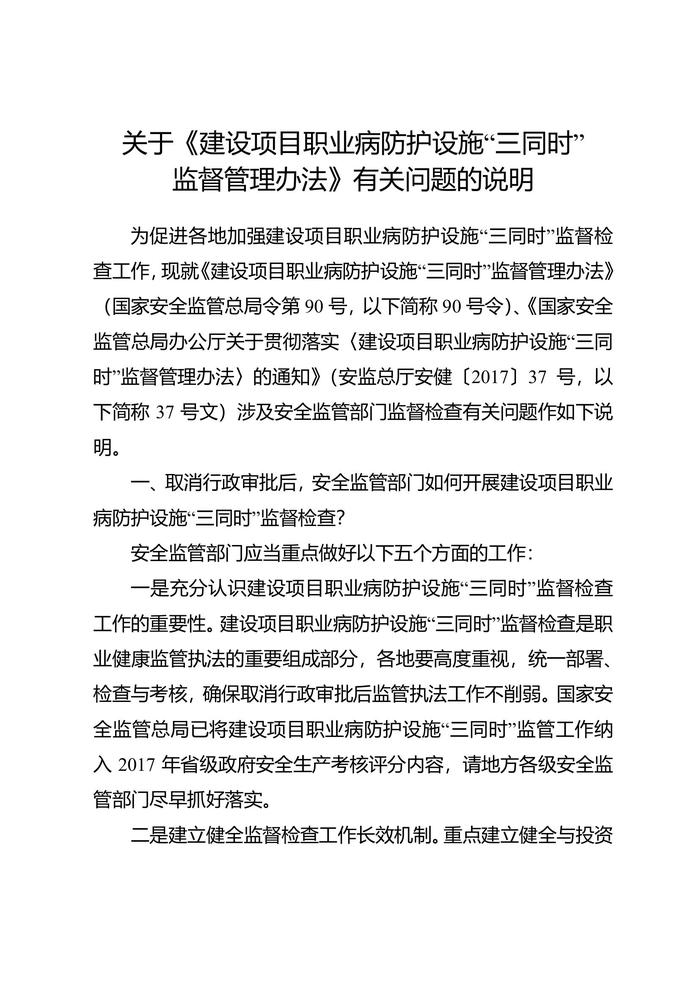 关于《建设项目职业病防护设施“三同时”监督管理办法》有关问题的说明 为促进各地加强建设项目职业病防护设施“三同时”监督检查工作,现就《建设项目职业病防护设施“三同时”监督管理办法》(国家安全监管总局令第90号,以下简称90号令)、《国家安全监管总局办公厅关于贯彻落实〈建设项目职业病防护设施“三同时”监督管理办法〉的通知》(安监总厅安健〔2017〕37号,以下简称37号文)涉及安全监管部门监督检查有关问题作如下说明。 一、取消行政审批后,安全监管部门如何开展建设项目职业病防护设施“三同时”监督检查? 安全监管部门应当重点做好以下五个方面的工作: 一是充分认识建设项目职业病防护设施“三同时”监督检查工作的重要性。建设项目职业病防护设施“三同时”监督检查是职业健康监管执法的重要组成部分,各地要高度重视,统一部署、检查与考核,确保取消行政审批后监管执法工作不削弱。国家安全监管总局已将建设项目职业病防护设施“三同时”监管工作纳入2017年省级政府安全生产考核评分内容,请地方各级安全监管部门尽早抓好落实。 二是建立健全监督检查工作长效机制。重点建立健全与投资主管部门的信息沟通与共享机制,以及建设项目安全设施与职业病防护设施“三同时”一体化监督执法机制。 三是切实履行监督检查职责。地方安监部门要制订符合实际的年度监督检查计划,重点对建设项目相对集中的工业区、开发区以及职业病危害严重行业领域建设单位开展监督检查,对存在违法行为的建设单位责令限期整改,下达限期整改执法文书,对逾期不整改或整改不到位的,依法进行处罚,不能只检查不执法处罚。 四是做好宣传教育培训。组织开展专题培训,确保安全监管执法人员正确领会和把握90号令规定的监督检查内容和37号文的具体要求。强化重点行业领域企业主要负责人和职业健康管理人员培训,明确其主体责任。积极宣传依法落实建设项目职业病防护设施“三同时”的先进建设单位,对典型违法违规建设单位进行曝光与通报。 五是建立监督检查信息通报制度。省级安全监管部门要定期统计分析建设项目职业病防护设施“三同时”监督检查信息,对不开展监督检查以及发现违法违规行为不依法进行处罚的地区要进行通报,并将有关情况报送国家安全监管总局职业健康司。 二、安全监管部门如何有效获取建设项目的信息? 当前地方各级安全监管部门可通过以下渠道获取建设项目信息: 一是通过全国投资项目在线审批监管平台了解各级政府层面审批、核准、备案的建设项目信息。 二是地方各级安全监管部门要主动与当地发展改革、工信、招商等部门建立建设项目信息交流机制,及时掌握有关建设项目信息。 三是建设单位通过公告栏、网站公布的建设项目职业病防护设施“三同时”信息。 四是建设单位向安全监管部门提交的建设项目职业病防护设施验收方案、职业病危害严重建设项目控制效果评价和职业病防护设施验收工作过程报告等有关信息。 五是相关举报信息。 三、如何理解和实施分类分级监督管理? (一)建设项目职业病危害风险分类 90号令将建设项目职业病危害风险分为严重、较重、一般三个类别,地方安全监管部门应当结合《国家安全监管总局关于公布建设项目职业病危害风险分类管理目录(2012年版)的通知》(安监总安健〔2012〕73号)文件精神和建设项目职业病危害评价报告对建设项目分类意见,对职业病危害严重建设项目实施重点监督检查,对较重、一般的建设项目实施随机抽查。 (二)建设项目职业病防护设施“三同时”分级监督检查 90号令第五条明确了建设项目职业病防护设施“三同时”分级监督检查的原则。国家安全生产监督管理总局在国务院规定的职责范围内对全国建设项目职业病防护设施“三同时”实施监督管理。省级安全生产监督管理部门负责制定本行政区域内的分类分级监管办法,明确省、市、县级安全监管部门的建设项目职业病防护设施“三同时”监管职责。 需要指出的是,国务院及其投资主管部门审批、核准或备案,并且跨省(自治区、直辖市)的建设项目由国家安全监管总局负责监督检查,其他(含国务院及其投资主管部门审批、核准或备案,但不跨省、自治区、直辖市)建设项目按照分级、属地监管的原则由地方安全监管部门负责监督检查。 四、如何实施建设项目职业病防护设施“三同时”与安全设施“三同时”一体化监督检查? 建设项目“三同时”一体化监管执法主要包括三个方面:一是对于非煤矿山、危险化学品等实施安全生产许可行业领域的建设项目,各级安全监管部门应当在审批建设项目安全设施“三同时”时,督促建设单位落实职业病防护设施“三同时”各项要求,提高这些行业领域的建设项目职业病防护设施“三同时”实施率(即建设项目职业病危害预评价、职业病防护设施设计、职业病危害控制效果评价和职业病防护设施验收的实施率)。二是地方各级安全监管部门在日常监督检查中,要依据年度执法计划开展监督检查工作,确保建设项目安全设施和职业病防护设施“三同时”工作同步部署、同步检查。三是将建设项目安全设施和职业病防护设施“三同时”监督检查纳入安全生产巡查和责任考核之中。 五、安全监管部门如