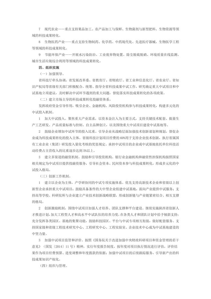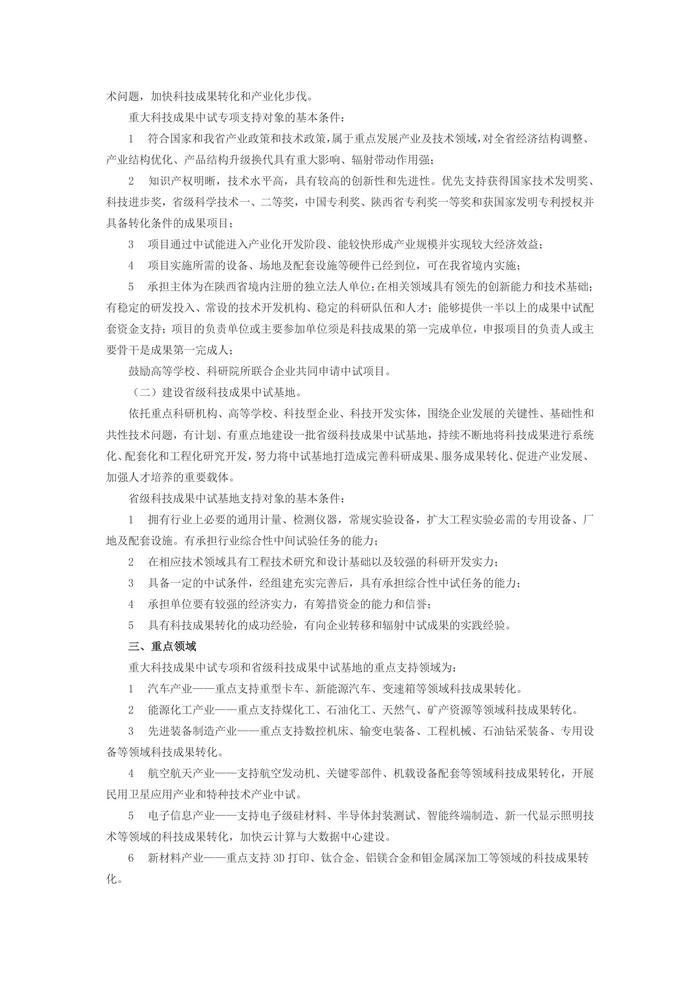 陕西省人民政府办公厅关于印发加强科技成果转化中试环节工作方案的通知陕政办发〔2014〕49号各设区市人民政府,省人民政府各工作部门、各直属机构: 《陕西省加强科技成果转化中试环节工作方案》已经省政府同意,现印发给你们,请认真贯彻落实。 陕西省人民政府办公厅 2014年6月14日 陕西省加强科技成果转化中试环节工作方案 中试是科技成果向现实生产力转化的关键环节。加强中试环节,对构建和完善以企业为主体的技术创新体系,加快科技成果转化与产业化,促进产业转型升级具有重要意义。为进一步加强我省中试环节工作,促进科技成果转化,制订本方案。 一、总体思路和基本原则 (一)总体思路。 以转方式调结构为主线,以加强中试环节、促进科技成果转化为目标,以企业为主体,以培育新支柱产业为重点,实施重大科技成果中试专项,加强中试基地建设,促进科技成果转化和产业化,加快创新型省份建设进程。 (二)基本原则。 坚持市场配置资源,政策引导支持的原则。充分发挥市场在资源配置中的决定性作用,按照市场机制聚集和配置各类资源;政府根据市场需求和技术走向,建立重大中试项目和中试基地建设动态管理机制,对重大科技成果转化项目给予引导支持。 坚持以企业为主体,产学研相结合的原则。始终坚持企业在科技创新中的主体地位,充分调动企业联合高等学校、科研院所参与中试项目和中试基地建设的积极性。对企业牵头,科研院所、高等学校共同承担的中试项目和建设的中试基地予以优先支持。 坚持重点示范,分步推进的原则。针对陕西优势产业和战略性新兴产业等重点领域,优选重大中试项目,按照“成熟一个,启动一个”的基本思路,按步骤、分层次稳步推进中试项目落实和中试基地建设。 二、总体目标和重点工作 通过实施中试专项,建设中试团队和中试基地,促进重大科技成果在省内实现转化和产业化。力争到2017年,培育省级科技成果中试基地20个,转化重大科技成果50项,基本建成完善的中试体系。 (一)实施重大科技成果中试专项。 以市场需求为导向,解决科技成果工程化放大及产业化应用过程中可能存在的关键和辅助配套技术问题,加快科技成果转化和产业化步伐。 重大科技成果中试专项支持对象的基本条件: 1符合国家和我省产业政策和技术政策,属于重点发展产业及技术领域,对全省经济结构调整、产业结构优化、产品结构升级换代具有重大影响、辐射带动作用强; 2知识产权明晰,技术水平高,具有较高的创新性和先进性。优先支持获得国家技术发明奖、科技进步奖,省级科学技术一、二等奖,中国专利奖、陕西省专利奖一等奖和获国家发明专利授权并具备转化条件的成果项目; 3项目通过中试能进入产业化开发阶段、能较快形成产业规模并实现较大经济效益; 4项目实施所需的设备、场地及配套设施等硬件已经到位,可在我省境内实施; 5承担主体为在陕西省境内注册的独立法人单位;在相关领域具有领先的创新能力和技术基础;有稳定的研发投入、常设的技术开发机构、稳定的科研队伍和人才;能够提供一半以上的成果中试配套资金支持;项目的负责单位或主要参加单位须是科技成果的第一完成单位,申报项目的负责人或主要骨干是成果第一完成人; 鼓励高等学校、科研院所联合企业共同申请中试项目。 (二)建设省级科技成果中试基地。 依托重点科研机构、高等学校、科技型企业、科技开发实体,围绕企业发展的关键性、基础性和共性技术问题,有计划、有重点地建设一批省级科技成果中试基地,持续不断地将科技成果进行系统化、配套化和工程化研究开发,努力将中试基地打造成完善科研成果、服务成果转化、促进产业发展、加强人才培养的重要载体。 省级科技成果中试基地支持对象的基本条件: 1拥有行业上必要的通用计量、检测仪器,常规实验设备,扩大工程实验必需的专用设备、厂地及配套设施。有承担行业综合性中间试验任务的能力; 2在相应技术领域具有工程技术研究和设计基础以及较强的科研开发实力; 3具备一定的中试条件,经组建充实完善后,具有承担综合性中试任务的能力; 4承担单位要有较强的经济实力,有筹措资金的能力和信誉; 5具有科技成果转化的成功经验,有向企业转移和辐射中试成果的实践经验。 三、重点领域 重大科技成果中试专项和省级科技成果中试基地的重点支持领域为: 1汽车产业——重点支持重型卡车、新能源汽车、变速箱等领域科技成果转化。 2能源化工产业——重点支持煤化工、石油化工、天然气、矿产资源等领域科技成果转化。 3先进装备制造产业——重点支持数控机床、输变电装备、工程机械、石油钻采装备、专用设备等领域科技成果转化。 4航空航天产业——支持航空发动机、关键零部件、机载设备配套等领域科技成果转化,开展民用卫星应用产业和特种技术产业中试。 5电子信息产业——支持电子级硅材料、半导体封装测试、智能终端制造、新一代显示照明技术等领域的科技成果转化,加快云计算与大数据中心建设。 6新材料产业——重点支持3D打印、钛合金、铝镁合金和钼金属深加工等领域的科技成果转化。 7现代农业——重点支持果品加工、农产品加工与保鲜、生物菌剂与新型肥料、生物资源等领域的科技成果转化。 8生物医药产业——重点支