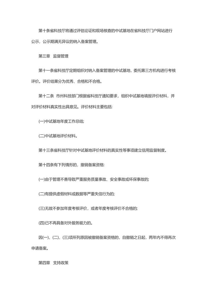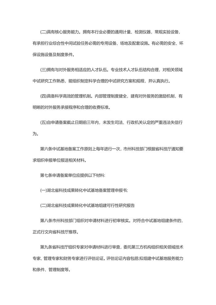 湖北省科技成果转化中试研究基地备案管理办法第一章 总则第一条为破解我省中小企业的中试验证难题,提升行业和企业自主创新能力,加快推进先进适用科技成果在省内转化和产业化应用,根据《中共湖北省委、湖北省人民政府关于加强科技创新引领高质量发展的若干意见》(鄂发〔2018〕28号)、《湖北省促进科技成果转移转化行动方案》(鄂政办发〔2017〕47号)精神,制定本办法。第二条本办法所称科技成果转化中试研究基地(简称中试基地),是指以科研平台为依托,为行业的科技成果进行二次开发实验,为企业规模生产提供成熟、适用、成套技术而开展中间试验的科研开发实体,是支撑产业链创新、助推科技成果转化的重要平台。第三条湖北省鼓励高等学校、科研院所和龙头企业依托优质科技创新资源,建设开放共享的中试基地,面向省内企业和科研单位提供中试研究服务。第四条省科技厅负责指导协调省级中试基地相关工作。市州科技部门负责所在地省级中试基地的申报、日常监管工作。第二章 备案条件和程序第五条纳入中试基地备案管理的单位(机构)应当具备以下基本条件:(一)具有对外服务的意愿。愿意发挥现有中试设施的作用,为行业内企业和科研单位提供中试研究服务;能够按照行业主管部门要求,严格规范服务行为。(二)具有核心服务能力。拥有本行业必要的通用计量、检测仪器,常规实验设备,有承担行业综合性中间试验任务必需的专用设备、场地及配套设施。有必需的安全、环保设施设备及制度条件。(三)拥有与对外服务相适应的人才队伍。专业技术人才队伍结构合理,对相关领域中试研究工作熟悉,能组织制定科学合理的中试研究方案和规程,并认真执行。(四)具备科学高效的管理机制。内部管理制度健全,建有对外服务的激励机制,有明晰的对外服务承接程序和合理的收费标准。(五)自申请备案截止日期前三年内,未发生司法、行政机关认定的严重违法失信行为。第六条中试基地备案工作原则上每年进行一次,市州科技部门根据省科技厅通知要求组织申报单位报送相关材料。第七条申请备案单位应提供以下材料:(一)湖北省科技成果转化中试基地备案管理申报书;(二)湖北省科技成果转化中试基地组建可行性研究报告第八条市州科技部门组织对申请材料进行初审核实。对符合中试基地组建条件的,正式行文向省科技厅推荐。第九条省科技厅组织专家对申请材料进行审查,委托第三方机构组织相关领域技术专家、管理专家和财务专家进行评估论证。评估论证内容包括:拟组建中试基地服务能力和条件、管理制度等。第十条省科技厅将通过评估论证和现场核查的中试基地在省科技厅门户网站进行公示,公示期满无异议的纳入备案管理。第三章 监督管理第十一条省科技厅定期组织对纳入备案管理的中试基地,委托第三方机构进行考核评价。评价结果分为优秀、合格和不合格。 第十二条 市州科技部门根据省科技厅通知要求,组织中试基地填报评价材料,并对评价材料真实性出具意见。评价材料主要包括:(一)中试基地年度工作总结;(二)中试基地评价材料。第十三条省科技厅针对中试基地评价材料的真实性等事项建立信用监督制度。第十四条有下列情形的,撤销备案资格:(一)由于管理不善导致严重服务质量事故、安全事故或环保事故的;(二)有提供虚假材料或数据等严重失信行为的;(三)无故不参加年度考核评价,或者年度考核评价不合格的;(四)已不再具备对外服务能力的。因(一)、(二)、(三)项所列原因被撤销备案资格的,自撤销之日起,两年内不得再次申请备案。第四章 支持政策第十五条省科技厅对纳入备案管理的中试基地统一授牌。第十六条省科技厅将中试基地纳入省科技创新平台专项,对考核评价优秀的予以奖补支持。第十七条支持符合条件的中试基地优先承担省科技计划(专项、基金)研发任务。第五章 附则第十八条各地可参照本办法,制定相应政策,支持中试基地建设与发展。第十九条本办法自发布之日起施行。第二十条 本办法由省科技厅负责解释。 湖北省科技厅 2019年12月30日