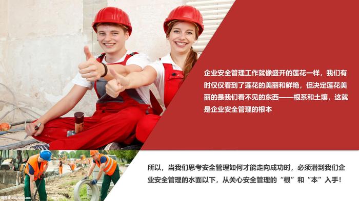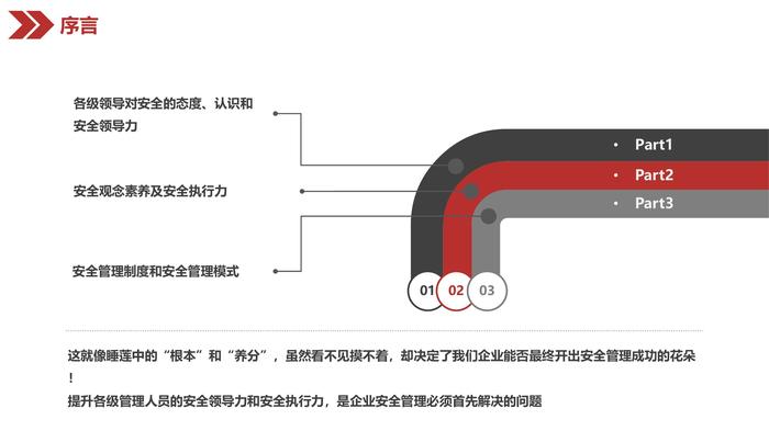 所以,当我们思考安全管理如何才能走向成功时,必须潜到我们企业安全管理的水面以下,从关心安全管理的“根”和“本”入手!企业安全管理工作就像盛开的莲花一样,我们有时仅仅看到了莲花的美丽和鲜艳,但决定莲花美丽的是我们看不见的东西——根系和土壤,这就是企业安全管理的根本序言010203Part1Part2Part3各级领导对安全的态度、认识和安全领导力安全观念素养及安全执行力安全管理制度和安全管理模式这就像睡莲中的“根本”和“养分”,虽然看不见摸不着,却决定了我们企业能否最终开出安全管理成功的花朵! 提升各级管理人员的安全领导力和安全执行力,是企业安全管理必须首先解决的问题01安全领导力与执行力概述安全管理责任决策层 安全方针与目标中层管理人员 安全期望与要求一线主管 关键作业与过程“我们要做什么?”员工 实施安全作业程序、指南与惯用做法 “我们如何做?安全事故统计安全领导力安全领导力安全领导力安全领导力 不仅是一把手董事长、总经理分管副总EHS主管部门经理车间主管班组长安全决策力:各级“领导”的正确决策至关重要安全影响力:“领导”的人格魅力是最好的推进剂安全感召力:率先垂范才能起到号召的作用安全学习力:拥有一定的安全知识和信息,才具备榜样的力量安全德行力:保障安全是一个“领导”品质与品位的象征安全领导力的构成安全领导力-LeadershipLEADER倾听-下面意见LISTEN布道-传递智慧EXPLAIN支持-必要资源ASSIST交谈-一线心声DISCUSS激励-安全榜样ENCOURAGE反应-异常状况RESPOND安全领导力-LeadershipSHIP感知性-有感领导SENSITIVITY身心和谐-心态心智HEALTH会议-收集以及传播信息INFORRMATION热情—人文关怀POSSION安全执行力安全执行力安全执行力 不仅是一线人员董事长、总经理(计划、决策)分管副总(不折不扣)EHS主管(尽职尽责)部门经理(严格落实)车间主管(风险管控)班组长(模范带头)安全执行力02安全领导者素养与职责安全领者素养与职责安全领导者素养与职责明确 目标激发 信任卓越领导者四大天职释放潜能整合体系安全领导者素质要求安全领导者素质要求人才不一定有口才;有口才必定是人才!规范、明了、准确如果前期的计划工作没有用心去策划、组织,必然导致后期的工作处于被动,处处应急、挽救,最终导致疲劳累死安全领导者素质要求沟通能力赞美是沟通的润滑剂,平等尊重,认真倾听,保持客观、开放的态度,恰当的提问学习能力昨天的知识,不一定解决今天的问题; 今天的经验,不一定适应明天的发展!安全领导者素质要求安全领导者素质要求安全领导者职责安全领导者职责安全领导者职责安全领导者职责第二十二条 生产经营单位采用新工艺、新技术、新材料或者使用新设备,必须了解、掌握其安全技术特性,采取有效的安全防护措施,并对从业人员进行专门的安全生产教育和培训(四新教育) 第二十三条 生产经营单位的特种作业人员必须按照国家有关规定经专门的安全作业培训,取得特种作业操作资格证书,方可上岗作业(特种作业教育) 生产经营单位安全培训规定安全领导者职责第三十八条规定:生产经营单位的安全生产管理人员应当根据本单位的生产经营特点,对安全生产状况进行经常性检查;对检查中发现的安全问题,应当立即处理;不能处理的,应当及时报告本单位有关负责人。检查及处理情况应当记录在案安全生产法安全领导者职责《安全生产事故报告和调查处理条例》于2007年6月1日起正式实施 第七条 任何单位和个人不得阻扰和干涉对事故的的报告和依法调查处理 第九条 事故发生后,事故现场有关人员应当立即向本单位负责人报告 第二十六条 事故发生单位的负责人和有关人员在事故调查期间不得擅离职守,并应当随时接受事故调查组的询问,如实提供有关情况。事故调查中发现涉嫌犯罪的,事故调查组应当及时将有关材料或者其复印件移交司法机关处理安全生产事故报告和调查处理条例安全领导者素养与职责安全生产对领导者的要求安全素质 企业管理层主要是指企业中的中层和基层管理部门的领导及干部。他们既要服从企业决策层的管理,又要管理基层的生产和经营人员,起到承上启下的作用,是企业生产经营决策的忠实贯彻者和执行者 中层管理者对企业安全生产管理的态度、投入程度等对企业起着决定性的作用。企业的安全生产状况,与企业领导的安全认识有着密切的关系 管理层的安全文化素质对整个企业的形象具有重要影响安全领导者素养与职责提高安全知识和技能 03现代安全管理-理念现代安全管理理念马斯洛需求理论生理需求呼吸、食物、水、睡眠、生理平衡、分泌如果这些需要任何一项得不到满足,人类个人的生理机能就无法正常运转。换而言之,人类的生命就会因此受到威胁人身安全、健康保障、财产所有性整个有机体是一个追求安全的机制,甚至可以把科学和人生观都看成是满足安全需要的一部分友情、亲情、爱情人人都希望得到相互的关系和照顾。感情上的需要比生理上的需要来的细致,它和一个人的生理特性、经历、教育、宗教信仰都有关系尊重、信心、成就希望自己有稳定的社会地位,要求个人的能力和成就得到社会的承认。尊重的需要又可分为内部尊重和外部尊重自我实现是最高层次的需求,包括针对于真善美至高人生境界获得