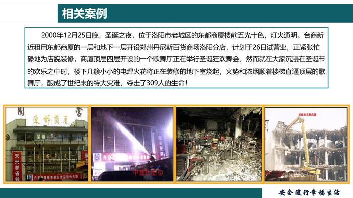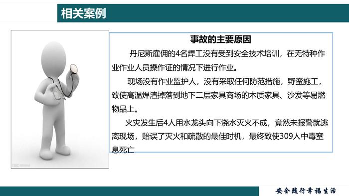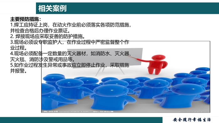 特殊作业现场安全监护教育培训 一切事故皆可避免相关案例 2000年12月25日晚,圣诞之夜,位于洛阳市老城区的东都商厦楼前五光十色,灯火通明。台商新近租用东都商厦的一层和地下一层开设郑州丹尼斯百货商场洛阳分店,计划于26日试营业,正紧张忙碌地为店貌装修,商厦顶层四层开设的一个歌舞厅正在举行圣诞狂欢舞会,然而就在大家沉浸在圣诞节的欢乐之中时,楼下几簇小小的电焊火花将正在装修的地下室烧起,火势和浓烟顺着楼梯直逼顶层的歌舞厅,酿成了世纪末的特大灾难,夺走了309人的生命!相关案例事故的主要原因 丹尼斯雇佣的4名焊工没有受到安全技术培训,在无特种作业作业人员操作证的情况下进行作业。 现场没有作业监护人,没有采取任何防范措施,野蛮施工,致使高温焊渣掉落到地下二层家具商场的木质家具、沙发等易燃物品上。 火灾发生后4人用水龙头向下浇水灭火不成,竟然未报警就逃离现场,贻误了灭火和疏散的最佳时机,最终致使309人中毒窒息死亡相关案例主要预防措施: 1.焊工应持证上岗,在动火作业前必须落实各项防范措施,并检查合格后办理作业票证。 2. 焊接现场应采取妥善的防护措施。 3.现场必须设专职监护人,在作业过程中严密监督整个作业过程。 4.现场必须配备一定数量的灭火器材,如消防水、灭火器、灭火毯、消防沙及警戒用品等。 5.如作业过程发生异常或事故应立即停止作业,采取措施并报警。 contents目 录1. 监护人的管理要求直接作业环节常常存在的问题: 1.无作业票或使用过期作业票; 2.作业风险识别不细,对作业风险认识不足,对重大风险作业无方案; 3.作业内容描述不详细; 4.风险消减措施不落实,未做到步步确认; 5.作业票填写不规范,填写不全面; 6.审批把关不严; 7.作业人员违章作业,超范围作业; 8.监护人能力不足或责任心不强; 9.对交叉作业认识不足,措施不到位。1. 监护人的管理要求1.1监护人的重要性:监护人是指对作业现场负有监督和保护责任的人员,是现场直接作业的最后一道防线什么是监护人?1. 监护人的管理要求监护人的重要性:可以很负责人的告诉你: 特殊作业监护人真的很重要!1. 监护人的管理要求为什么要设立 监护人呢?安装、检修、维护、故障处理、物料处理等作业时现场环境十分复杂,甚至是在不停车、待料的状态进行,如措施不到位、监督不严格,生产发生异常、作业环境产生改变时极易发生起火、爆炸、窒息和电击、物体打击等事故或伤害!1. 监护人的管理要求 作业人员也可能为图快、省劲等而采取违章作业等冒险行为,也极易造成人身伤害。 安全监护人就是在作业现场及时监督、发现、提醒、制止违章行为,保证整个作业活动顺利进行,保证作业人员的安全。认真点,说你呢!1. 监护人的管理要求1.2监护人员的能力要求:掌握被监护对象的工作内容、工作范围和安全施工方案应具备一定的工作经验,较强的责任心和敬业精神熟悉作业现场、工艺流程、设备、物料及周围的环境状况掌握防火、防爆、防中毒、防窒息、防触电等的一般常识掌握现场急救的一般常识会报警,会使用消防器材1. 监护人的管理要求1.3监护人的职责: 执行监护任务时应佩戴明显的标志作业过程中不应离开现场,不得做与监护无关的事情,如确需离开,应有人接替或暂停作业在接到监护作业要求后,应逐项检查落实各项防范措施检查现场情况,监护期间须按要求穿戴好劳动防护用品,注意自身安全1. 监护人的管理要求在作业完成半小时后,确认作业现场无任何隐患方可离开作业现场监护人的职责:作业过程中发现异常应及时采取措施监护过程中,对违章行为应立即制止,有权停止其作业,并向属地管理人员或安全管理部门汇报出现任何意外或发生事故,应 “以人为本” 组织应急处置并及时上报1. 监护人的管理要求1. 4 监护人的权力有四项基本权利: 1. 制止违章行为 2. 收回作业许可 3. 汇报上级主管 4. 停止进行作业1. 监护人的管理要求1.5监护人的工作内容:熟悉施工负责人、实际作业人,包括对方的姓名、作业资质、职务和联系方式对作业环境进行检查确认(主要看是否达到安全作业条件)检查安全措施的落实情况(吹扫、置换、隔离、封堵、断电挂牌、脚手架、工具、设备等),确认到位后在作业票证上签字确认1. 监护人的管理要求1.5监护人的工作内容:1. 监护人的管理要求1.5监护人的工作内容:1. 监护人的管理要求1.6安全监护人可以停止整个作业活动的情况: 作业时间、部位、人员、内容发生改变 作业环境和条件发生变化 进行的作业与施工方案发生重大偏离 发现有可能造成人身伤害的违章行为 现场作业人员发现重大安全隐患 事故状态下并同时上报项目负责人!①2、监护的综合安全措施•盲板抽堵作业•临时用电作业•断路作业2、监护的综合安全措施2.1动火作业 能直接或间接产生明火的工艺设备以外的非常规作业。如在禁火区内使用电焊、气焊(割)、喷灯、电钻、砂轮等可能产生火焰、火花或炽热表面的非常规作业。 专门设置的满足动火安全要求的固定场所和生产用火除外!2、监护的综合安全措施根据动火风险大小,动火作业分为三级 在生产运行状态下的易燃易爆生产装置、输送管道、储罐、容器等部位上及其它特殊危险场所进行的动火作业,带压不置换作业按特殊动火作业管理 在易燃易爆场所进