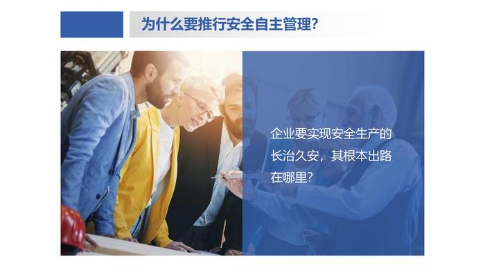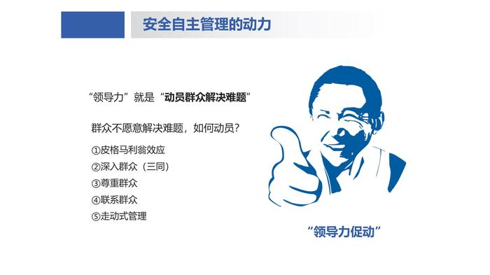 对自主管理 的误解下属自己管理自己领导不用操心了员工就好主动参与马不扬鞭自奋蹄管理上的小儿科解决不了多大问题只能做些小事情………对自主管理的误解为什么要推行安全自主管理?企业要实现安全生产的长治久安,其根本出路在哪里?安全自主管理的动力“领导力促动” “领导力”就是“动员群众解决难题”群众不愿意解决难题,如何动员?①皮格马利翁效应 ②深入群众(三同) ③尊重群众 ④联系群众 ⑤走动式管理什么是“安全自主管理”?“管理者为实现安全管理的终极目标,为 员工精心搭建的、激励员工主动参与、能充分展示员工聪明才智的管理平台”。一种高级管理智慧安全自主管理的三要素管理者的精心计划、设计、安排有促使全员参与的一套活动方法建立一个有效的促动的激励机制123否则,班组自主管理只能自生自灭!自主管理的内生动力是什么?【员工】--存在感 --荣誉感 --自我价值体现自主管理的外部环境是什么?【领导】--三个机制:KPI机制、检查机制、激励机制 --一个通道:员工职业生涯成长通道 --三公环境:公开、公平、公正安全自主管理的三要素安全自主管理16种方法分享与反省安全分享三分钟 “一口清”分享 “吓一跳”事件分享 每日安全反省自己动手视频:规范班前班后会 视频:作业安全分析 图解:作业行为正误集 看板:安全日历活动自主培训安全行动单点课程(OPL) 我来讲一课 安全大讲堂 改善提案发表安全自我提醒 主动关爱活动 安全行为观察 防灾应急演练“分享与反省”的4种方 法 安全 分享一口清分享班后会反省吓一跳分享安全3”分享安全自主管理,先从自己开始:人人参与的安全分享---天天讲、人人讲、处处讲; 安全自主管理,先从反省开始:天天进行的自我反省---说一遍、做一遍、想一遍; 安全自主管理,力所能及开始:共同营造安全的氛围---说出来、写出来、亮出来。适合开展活动的场所:班前班后会、安全活动日、各种会议之前、举办主题竞赛; 拓展活动的功能效果:录音、录像、留言、留影;整理成文字,编辑优秀文集; 打造持续改进的机制:当场讲评、培训展示、展开讨论、逐级选拔、表彰奖励。安全自主管理16种方法自主培训4方法 1234OPL我来讲一课 安全大讲堂 改善提案发表 安全自主管理16种方法OPL(One Point Lesson)一般称 一点课、单点课是一种在现场进行培训的教育方式。课程内容课程教材课程开发者课程讲授者效果评价选择一个问题,题目不能太大,要能在10分钟之内讲完;只用一页纸,图文并茂,结构整齐、条理清楚、简单明确;是现场作业人员,而不是专业的企业讲师。OPL与改善提案(合理化建议)一样,是提升企业员工参与精神的一种方法;一般为课程的设计与开发人员本人,即谁设计谁讲解。 自己选课题、自己开发课程、自己讲解课程。突出现场效果, 侧重于对工作改善和绩效提高的积极作用。安全自主管理16种方法表头:单位,编写人,日期2. 课程分类: ①基础知识②问题实例③改善实例3. 题目…, 编号:… 4. 内容 (分类说明)5. 受训者签名:……6. 上级审核:车间主任……安全自主管理16种方法“我来上一课”对 OPL 课程的培训 改善案例的发表 班组业务学习班组利用班前班后会、安全活动日、业务学习日等活动时间,用员工自己制作的OPL 、现场改善案例为教材,员工走上讲台当讲师。组织员工进行自主培训。培训的内容不但结合工作实际,还锻炼了员工,提高了员工的综合素质。安全自主管理16种方法班组安全“大讲堂” “安全大讲堂”是班组开展安全活动的一种形式。一般由班长、安全员或群监员针对典型事故案例或生产作业中的突出问题,进行专题分析和讲解。 安全自主管理16种方法班组安全“大讲堂” 安全自主管理16种方法改善提案发表会改善提案活动成果展示和推广,需要一个常态化的交流探讨活动。这个活动就是“现场改善成果发表会”。 发表会一般在部门和公司按照计划定期召开,领导和相关员工参加。安全自主管理16种方法为解决现场问题而提出的可行方案。改善对象人、机、料、法、环、测;改善内容①消除现场浪费 ②消除安全隐患 ③降低成本、提高质量 ④提高劳动效率安全自主管理16种方法改善案例的编写方法简单问题的改善4步法:1. 现场描述 (数据) 2. 问题点 (一句话) 3. 改善方案 (图示) 4. 改善效果 (对比)安全自主管理16种方法抛开固有观念培养问题意识找理由与想办法有问题立即改正有困难才有智慧“五个为什么”少花钱多办事人人开动脑筋数量胜于质量改善无止境改善十律安全自主管理16种方法班前会 “5+7 ”范式时间:班前10分钟 地点:活动室操作室现场 准备:①巡视作业现场 ②了解上班情况 ③熟悉上级要求 ④ 检查劳保穿戴 ⑤观察精神状态 内容: ①点名 1分钟 ②传达上级要求 1分钟 ③对昨天工作的讲评 1分钟 ④布置当班生产任务 3分钟 ⑤安全注意事项 2分钟 ⑥对员工进行培训 3分钟 ⑦互动交流 1分钟安全自主管理16种方法把视频技术引入班前会 1.视频技术—现代化的信息手段;2.移动互联时代自媒体无处不在;3.人在镜头前产生 “自律”表现;4.从视频影像中看到不同的自己;5.视频可以反复回放,观察细节。安全自主管理16种方法为什么要求班前会拍摄之后回放?自己找出问题,才能有效改进。 看看自己的团队能不能拿出手。 群体效应在反复练习中